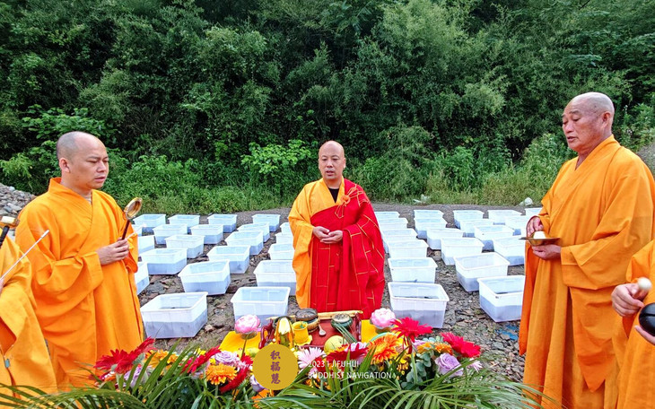 九华河边设香案,主法法师焚香礼拜,诸位法师依佛教仪轨诵《大悲咒》、《心经》、《往生咒》、读忏悔文、皈依文、发愿文、回向文。