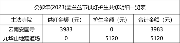 积福慧癸卯年盂兰盆节暨佛欢喜日活动自2023年8月7日启建,至2023年8月30日23时停止接收功德款,共计24天。同修随喜供灯款3983元,护生款5120元。