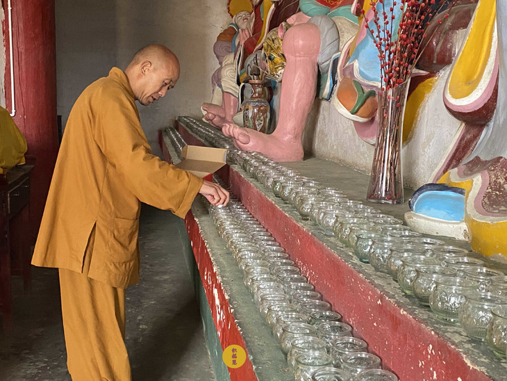 将酥油灯灯芯挑起,置入玻璃瓶内,做到万无一失。