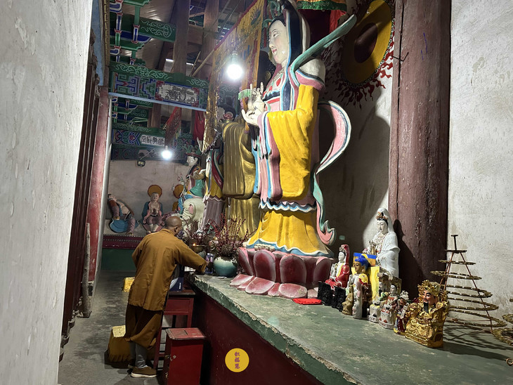法师带领义工布置法会现场,洒扫供台,供品整齐归位。