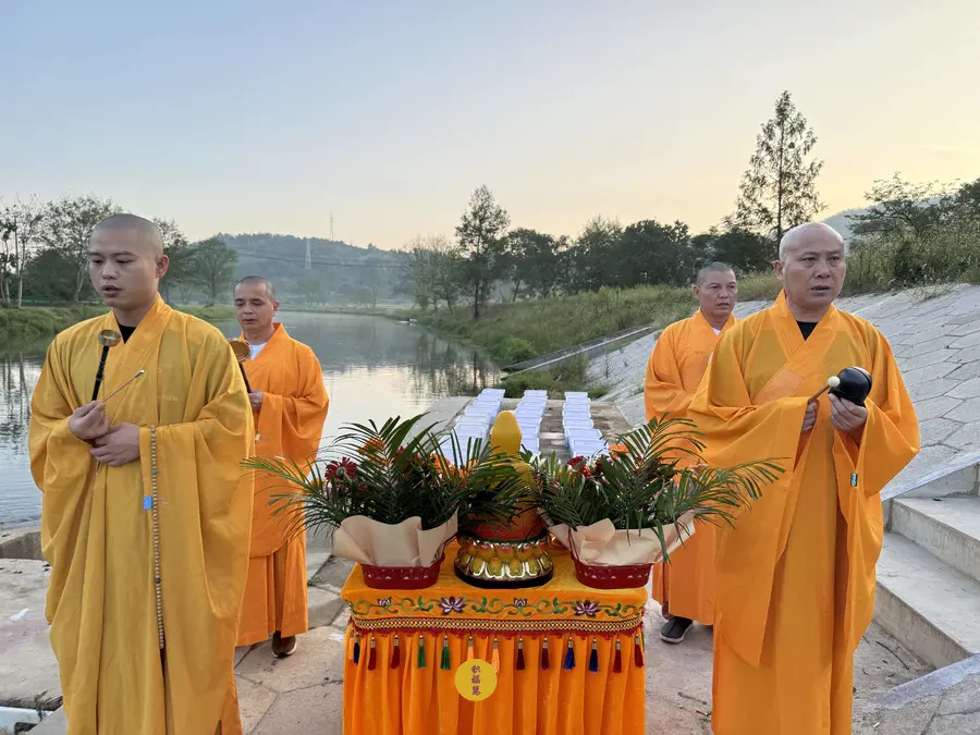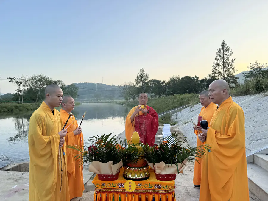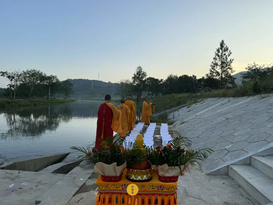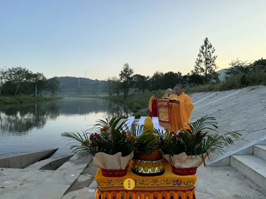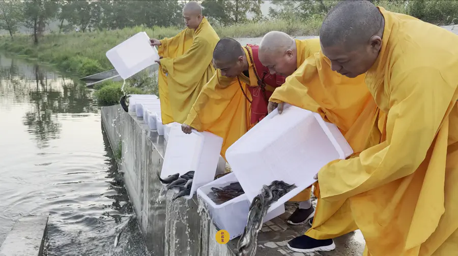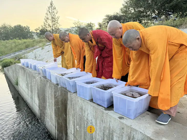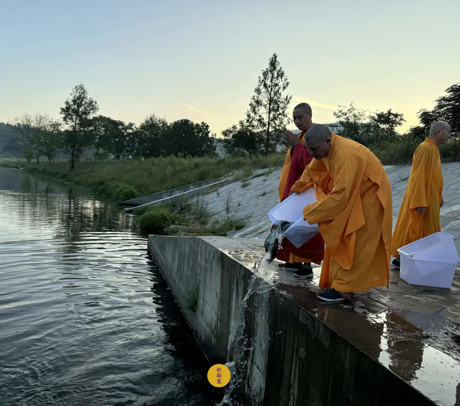 2024年9月10日,甲辰年八月初八,九华山西来禅寺诸位法师在安徽省池州市青阳县焦村九华河放生鲫鱼、鲤鱼、泥鳅等水族众生。
