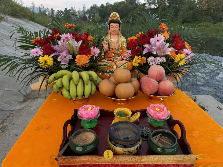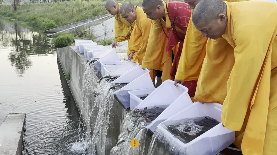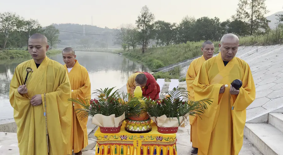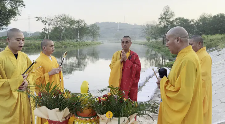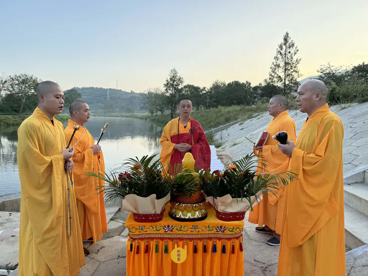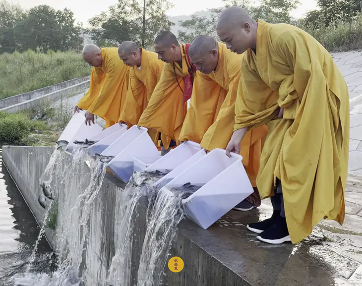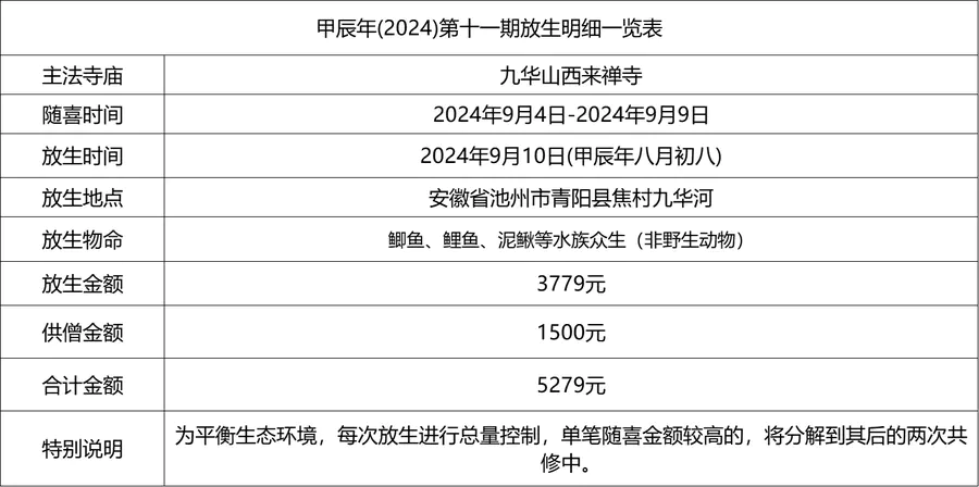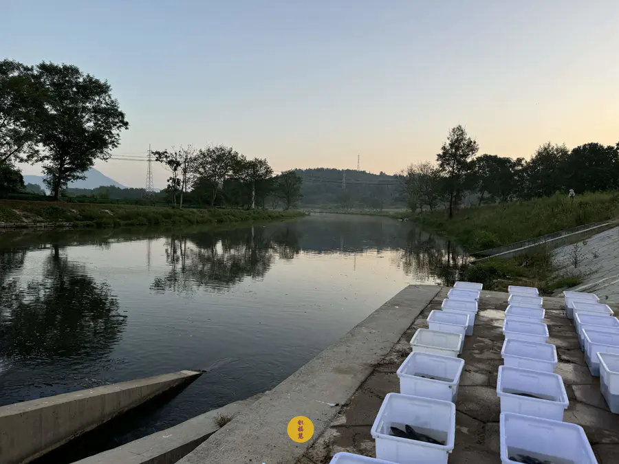 2024年9月10日,甲辰年八月初八,九华山西来禅寺诸位法师在安徽省池州市青阳县焦村九华河放生鲫鱼、鲤鱼、泥鳅等水族众生。