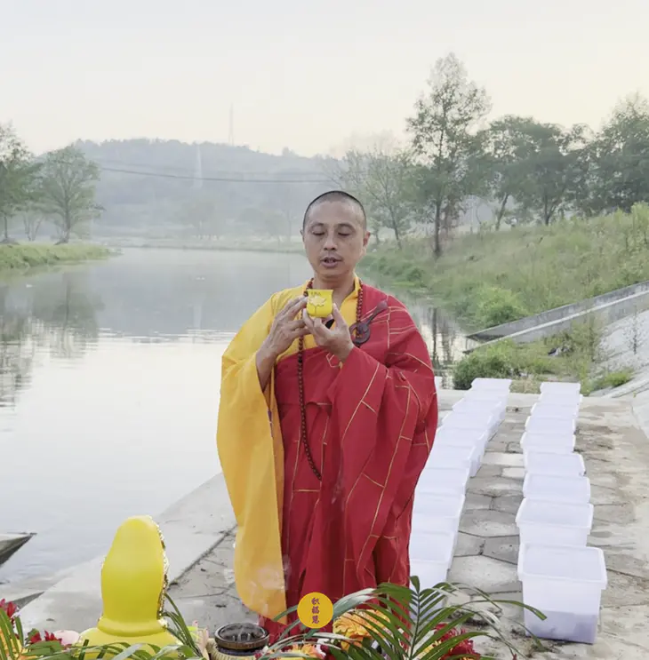 主法法师手执净水杯颂《说水文》,在梵呗声中,为被放众生遍洒甘露水,种下菩提种子。