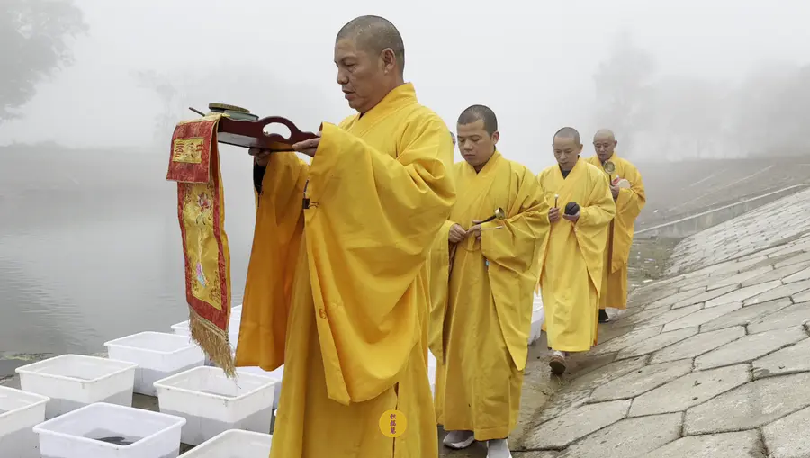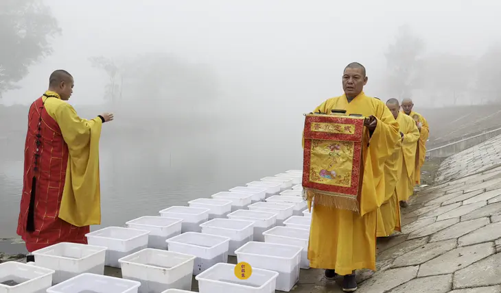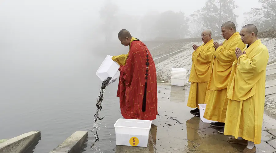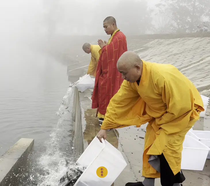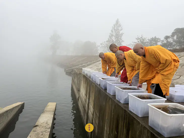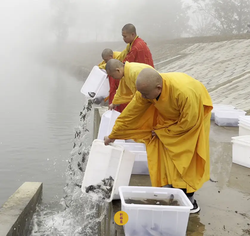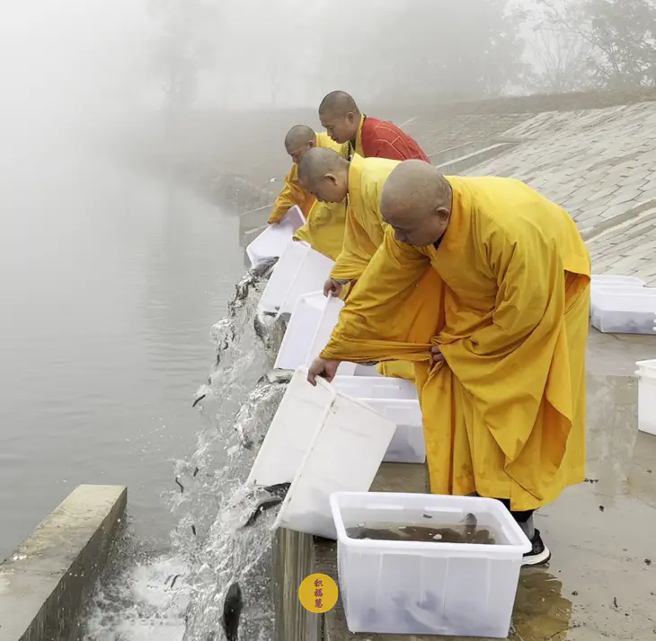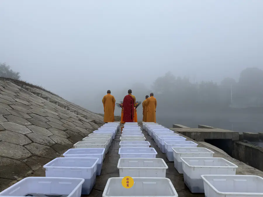 2024年11月7日,甲辰年十月初七,九华山西来禅寺诸位法师在安徽省池州市青阳县焦村九华河放生鲫鱼、鲤鱼、泥鳅等水族众生。