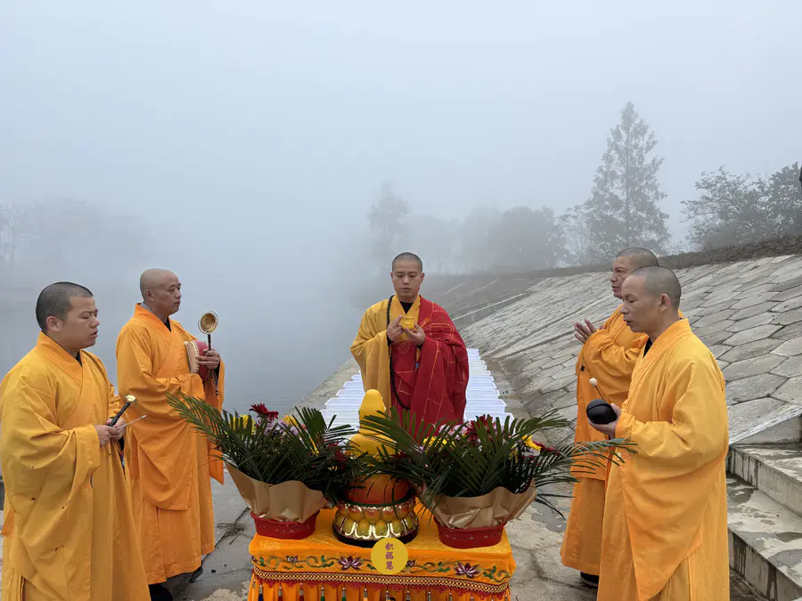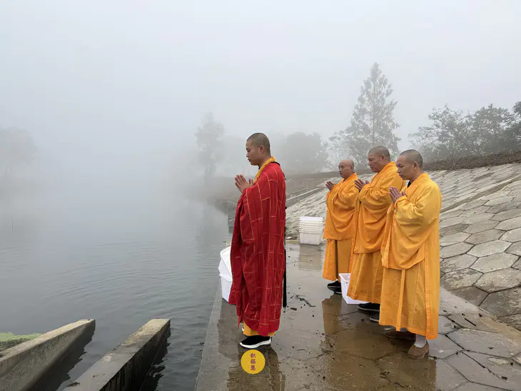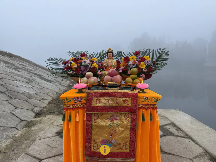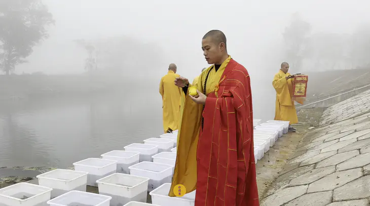 立冬时节,天转寒凉,九华河边,晨雾蒙蒙。放生法会已准备就绪。
