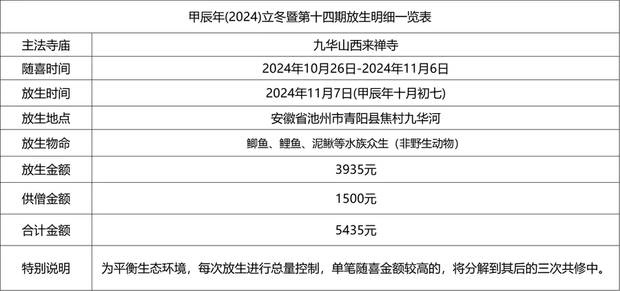积福慧以此甲辰年立冬暨第十四期放生共修功德回向亲自放生者、出资者、乃至一念随喜者,籍此万物冬藏之际,休养生息,养精蓄锐,韬光养晦,厚积薄发。回向累世父母、六亲眷属,蒙佛接引、离苦得乐、早证菩提。