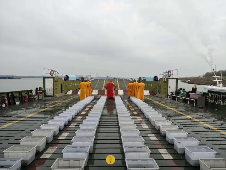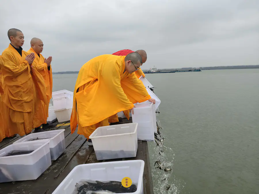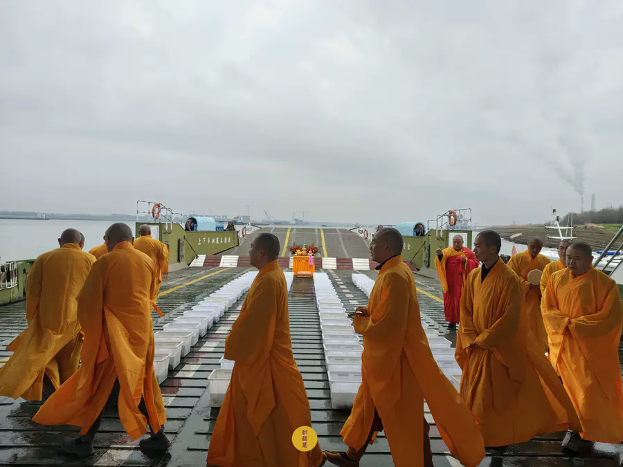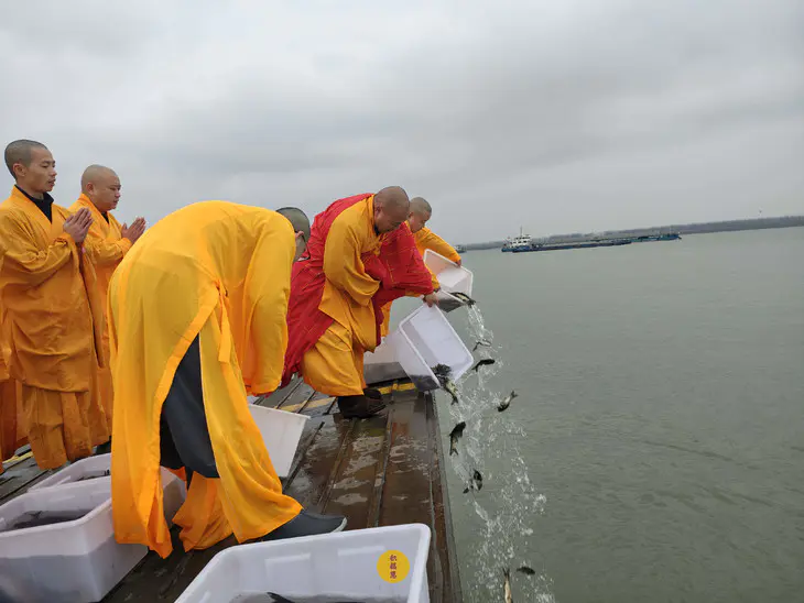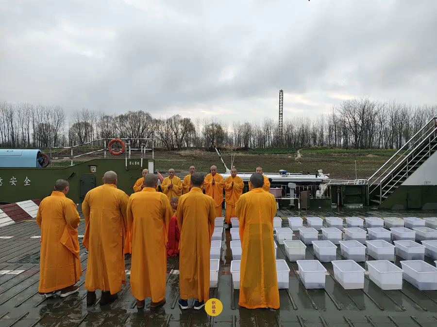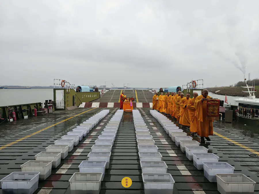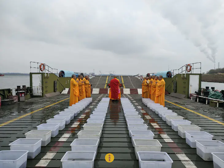 2025年2月28日,乙巳年二月初一,九华山西来禅寺诸位法师在安徽省池州市贵池区长江汽车轮渡码头启建乙巳年第二期放生法会,放生鲫鱼、鲤鱼等水族众生。