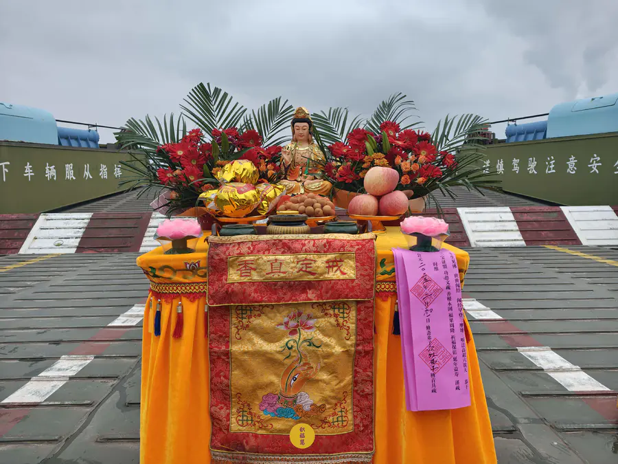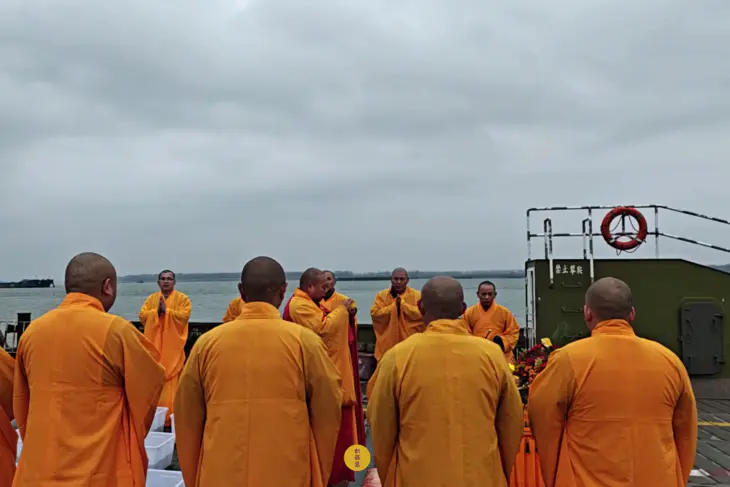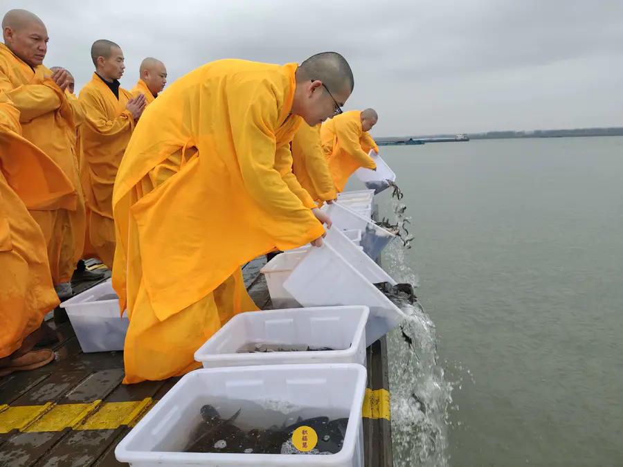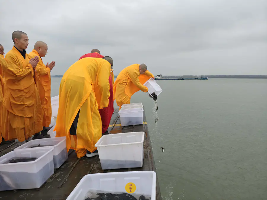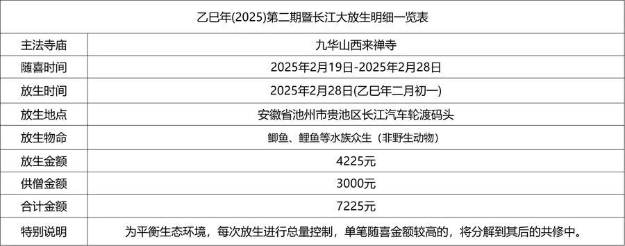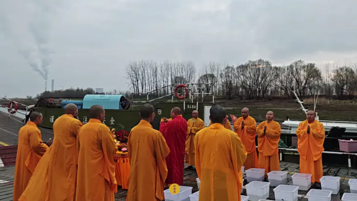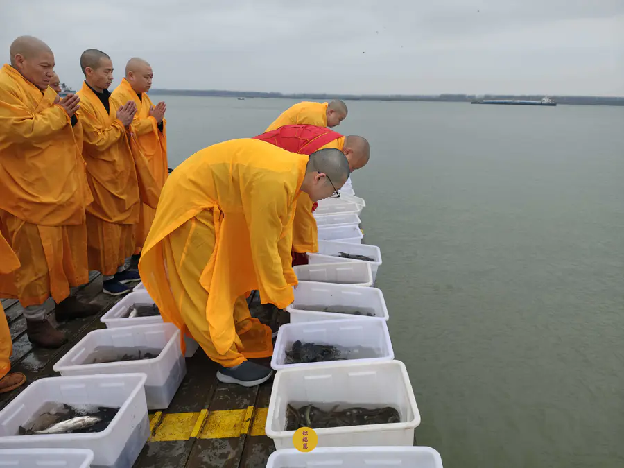 2025年2月28日,乙巳年二月初一,九华山西来禅寺诸位法师在安徽省池州市贵池区长江汽车轮渡码头启建乙巳年第二期放生法会,放生鲫鱼、鲤鱼等水族众生。