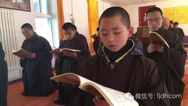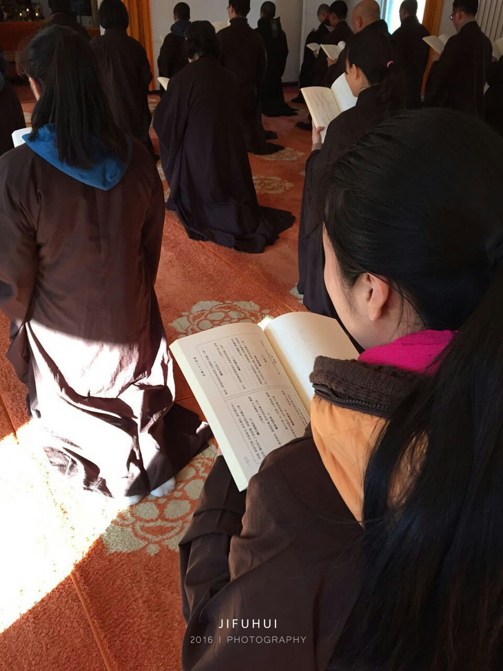 传灯结束后,与会大众来到佛堂依次排班,由则所法师领众诵经。