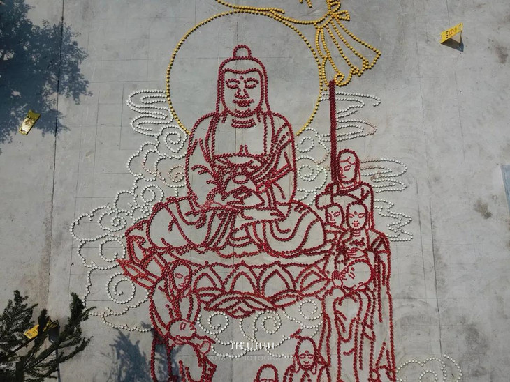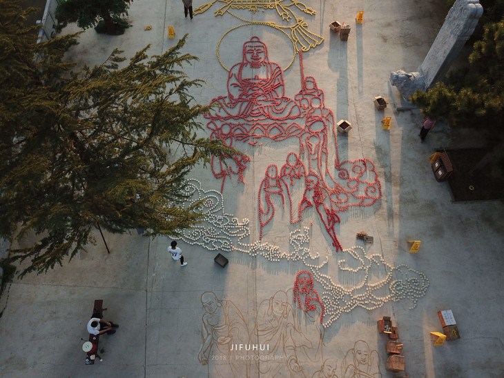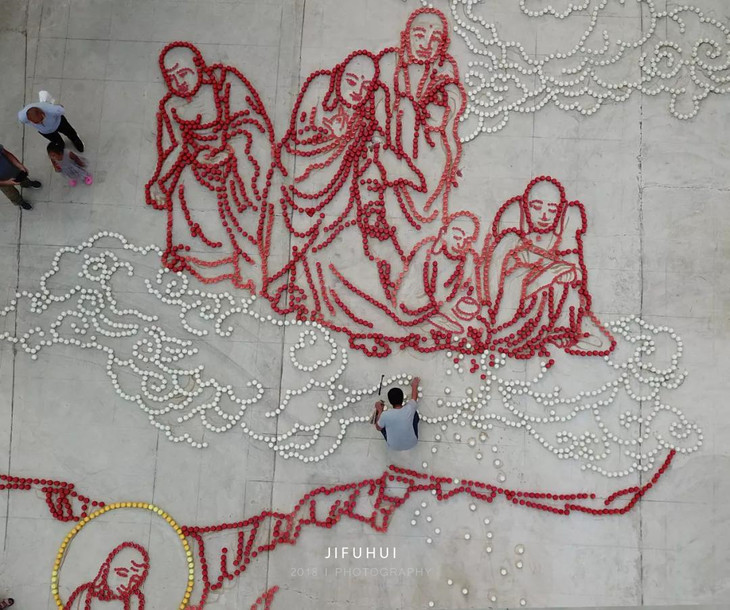 义工老师们连夜测绘打线,六十多岁的来坤师父,顶着烈日,跟几位擅长绘画的师兄一起,将线稿用泥水画在广场上,义工师兄们将万盏自己熬制的酥油灯,趁借天光,一一摆在地线之上。