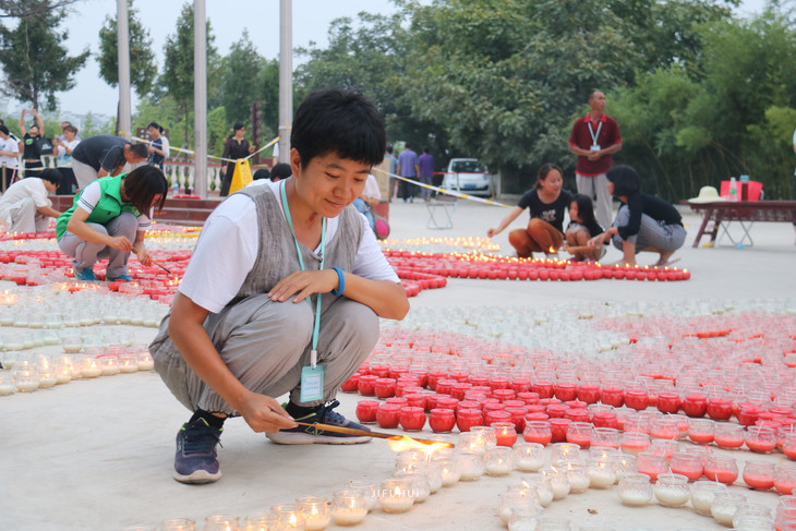 绘制供灯佛像的参与者傅老师,认真点灯