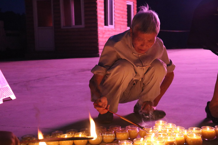 老居士虔诚燃灯