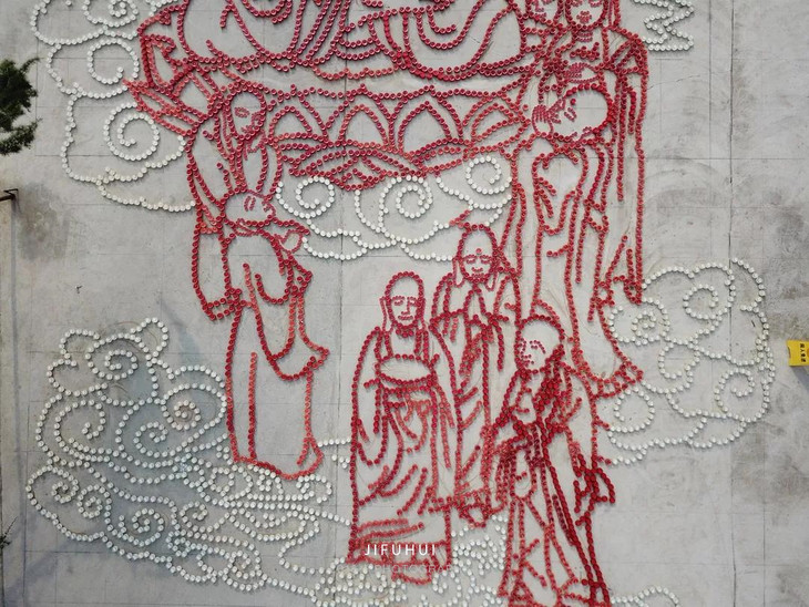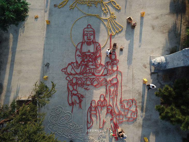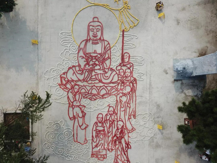 经过义工们整整三天的努力,这幅由宽见法师提议,来坤法师历时三月余创作的盂兰盆法会图,终于从纸张中跃然呈现于整个广场上。