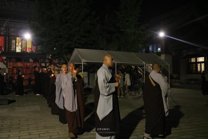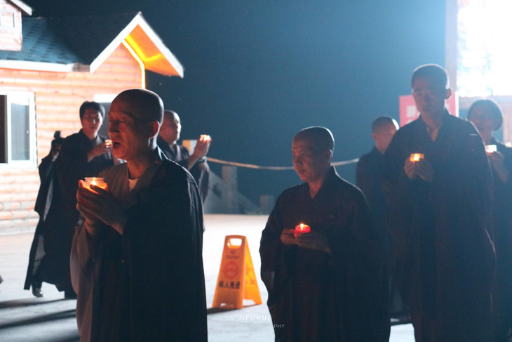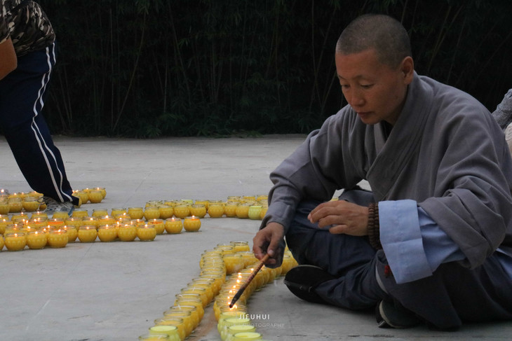 5、师父带领大众,手捧供灯,井然有序的从大殿到广场供灯前,念佛、绕佛
