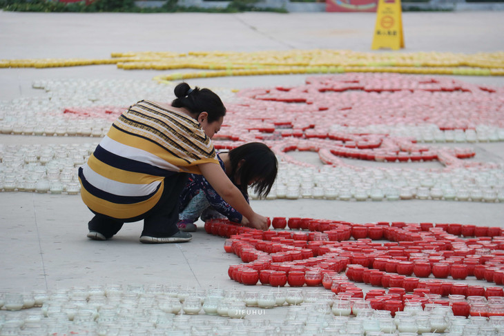 小朋友认真点亮莲灯