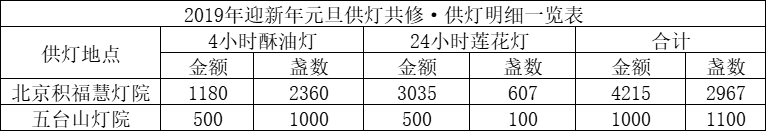 2019年1月1日,元旦当天,积福慧分别在北京积福慧灯院、五台山灯院启建供灯法会,如理如法按次第起供,至1月15日供圆满。