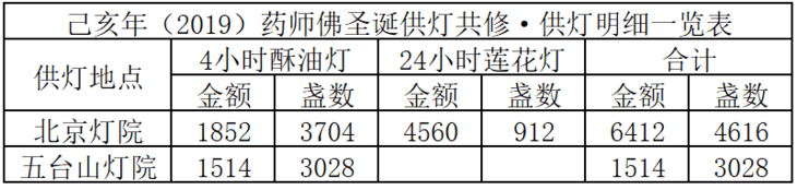 2019年10月27日,药师佛圣诞当天,积福慧分别在北京灯院、五台山灯院举行供灯法会,如理如法按次第起供,至11月2日供圆满。合计供4小时酥油灯6732盏,供24小时莲花灯912盏。