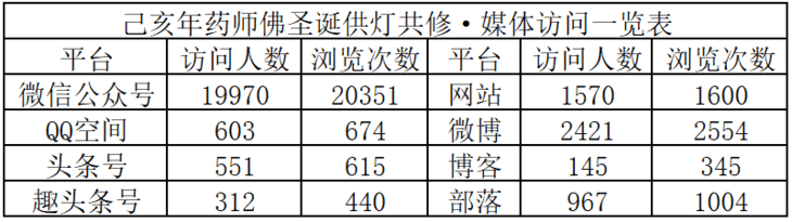 在此期间,佛教导航各媒体平台发布共修活动页面,访问总人数26539人,页面总浏览量27583次。共有4276人次通过积福慧微商城、微信群、微信转账等方式参与,随喜供灯款总额7926元。