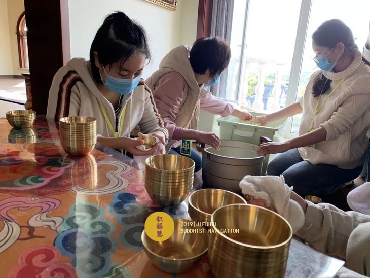 义工细心的清洗、擦拭供水杯