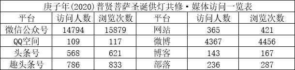 在此期间,佛教导航各媒体平台发布共修活动页面,访问总人数21368人,页面总浏览量22781次。共有1456人次通过积福慧微商城、微信群、微信、支付宝转账等方式参与,随喜供灯款总额6455元。