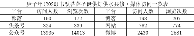 在此期间,佛教导航各媒体平台发布共修活动页面,访问总人数17809人,页面总浏览量18086次。通过积福慧微商城、微信群、微信、支付宝转账等方式,随喜供灯款总额4765元,供水款总额2570元。