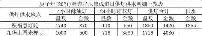 值此殊胜因缘,应大众所请,积福慧、佛教导航与江浙佛教联合九华山道场启建庚子年释迦牟尼佛成道日暨腊八节供灯、供水共修。共修自2021年1月8日始,至2021年1月20日23时止,共计23天。随喜供灯款5500元,供水款1355元。