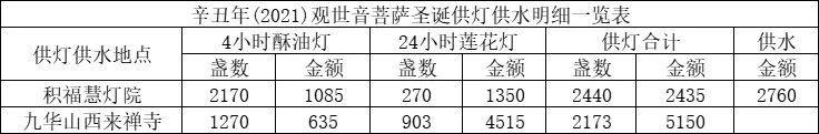 值此殊胜因缘,应大众所请,积福慧、佛教导航与江浙佛教联合九华山道场启建辛丑年观世音菩萨圣诞供灯、供水共修。共修自2021年3月6日始,到2021年3月31日23时止,共计26天。同修随喜供灯款7485元、供水款2760元。