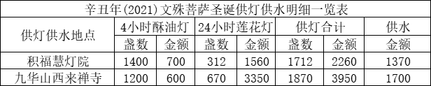 值此殊胜功德日,应大众所请,积福慧、佛教导航及江浙佛教联合九华山道场启建文殊菩萨圣诞暨迎中高考供灯供水共修。共修自2021年5月1日始,到2021年5月15日24时止,共计15天。同修随喜供灯款6210元、供水款3070元。