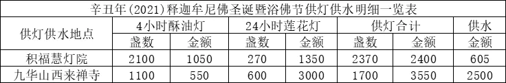 值此殊胜功德日,应大众所请,积福慧、佛教导航及江浙佛教联合九华山道场启建释迦牟尼佛圣诞暨浴佛节供灯供水共修。共修自2021年5月17日始,到2021年5月19日24时止,共计3天。同修随喜供灯款5950元、供水款3105元。