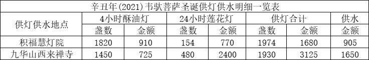 值此殊胜功德日,应大众所请,积福慧、佛教导航及江浙佛教联合九华山道场启建韦驮菩萨圣诞供灯供水共修。共修自2021年7月11日始,到2021年7月12日24时止,共计2天。同修随喜供灯款4805元、供水款2555元。
