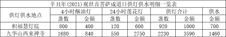 值此殊胜功德日,应大众所请,积福慧、佛教导航及江浙佛教联合九华山道场启建观世音菩萨成道日供灯供水共修。共修自2021年7月21日始,到2021年7月28日24时止,共计8天。同修随喜供灯款4590元、供水款2160元。