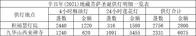 值此殊胜功德日,应大众所请,积福慧、佛教导航及江浙佛教联合九华山道场启建辛丑年地藏菩萨圣诞供灯共修。共修自2021年8月25日始,到2021年9月6日23时止,共计13天。同修随喜供灯款8875元。