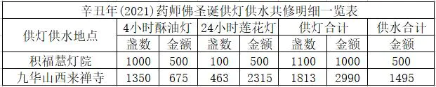 值此殊胜功德日,应大众所请,积福慧、佛教导航与江浙佛教联合九华山道场启建辛丑年药师佛圣诞供灯供水共修。共修自2021年10月27日始,至2021年11月4日23时止,共计9天。同修随喜供灯款3990元、供水款1995元。