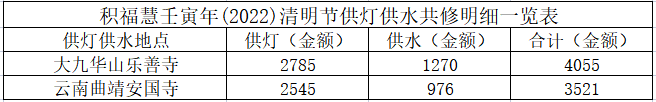 积福慧联合九华山道场、曲靖道场启建壬寅年清明节供灯、供水共修,共修自2022年3月25日始,至2022年4月5日23时止,共计12天。同修随喜供灯款5330元,供水款2246元。