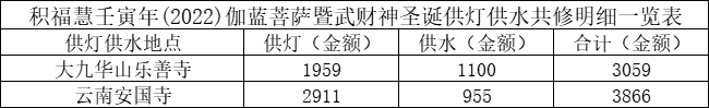 积福慧联合九华山道场、曲靖道场启建壬寅年伽蓝菩萨暨武财神圣诞供灯、供水共修。共修自2022年6月3日始,至2022年6月11日23时止,共计9天。同修随喜供灯款4870元,供水款2055元。