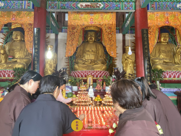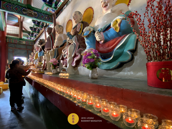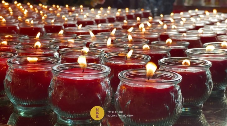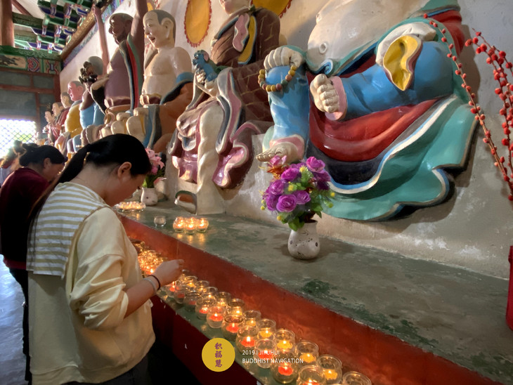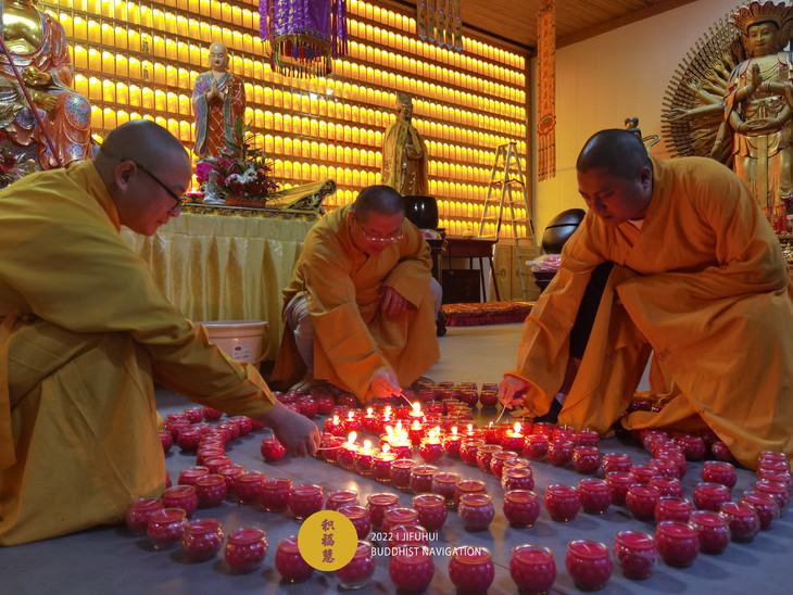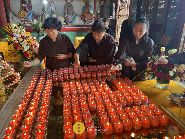 曲靖道场在九月初九这一天同步举行供灯供水法会。护法居士们正心诚意在佛前点燃长明灯。