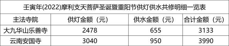 壬寅年摩利支天菩萨圣诞暨重阳节供灯供水共修自2022年9月24日始,至2022年10月4日23时止,共计10天,同修随喜供灯款5518元、供水款1605元。