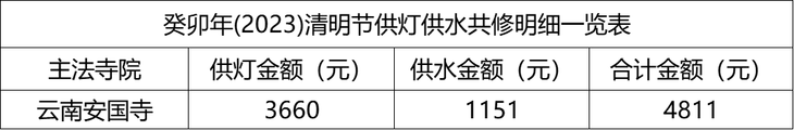 积福慧癸卯年清明节供灯供水共修自2023年3月11日启建,至2023年4月5日23时停止接收功德款,共计26天。同修随喜供灯款3660元,供水款1151元。