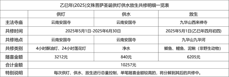 积福慧乙巳年文殊菩萨圣诞供灯供水放生共修自2025年3月23日启建,至2025年5月1日停止接收功德款(应大众所请,截止时间延长1小时至24点),共计40天。