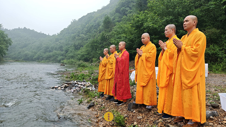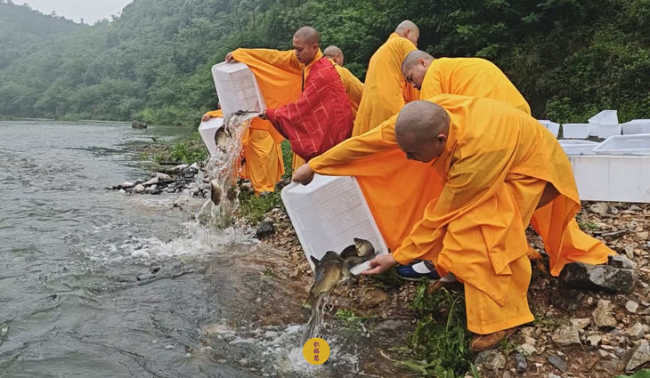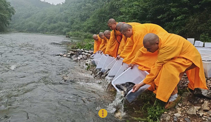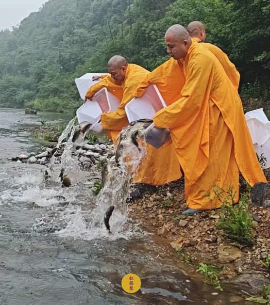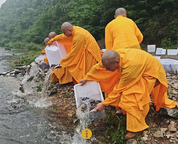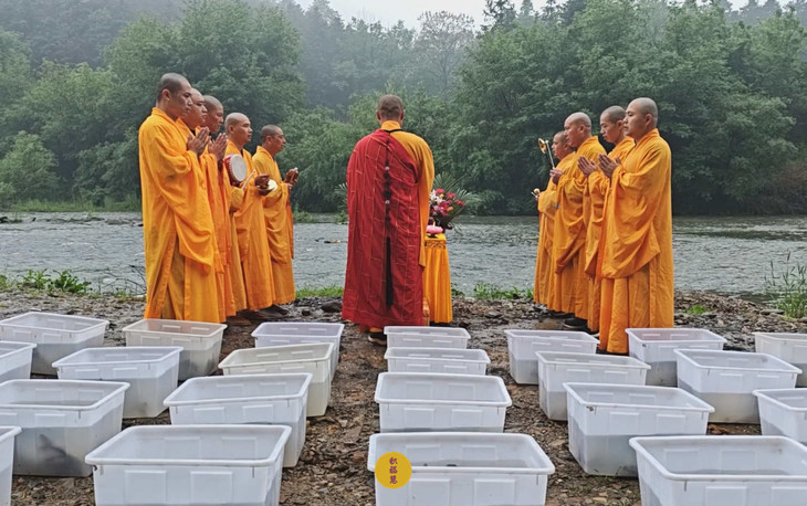 春雨过后,九华河水位渐涨。九华山西来禅寺诸位法师在文殊菩萨圣诞日启建放生法会。