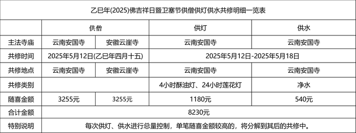 积福慧乙巳年佛吉祥日暨卫塞节供僧供灯供水共修自2025年5月3日启建,至2025年5月12日停止接收功德款(应大众所请,截止时间延长1小时至24点),共计10天。