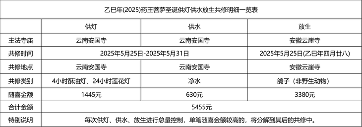 积福慧乙巳年药王菩萨圣诞供灯供水放生共修自2025年5月9日启建,至2025年5月25日停止接收功德款,共计17天。