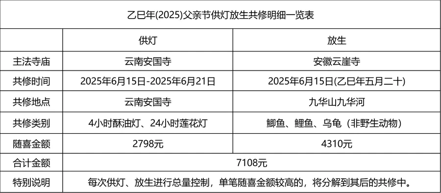 积福慧乙巳年(2025)父亲节供灯放生共修自2025年6月4日启建,至2025年6月15日停止接收功德款,共计12天。