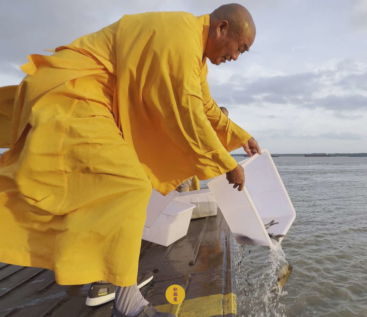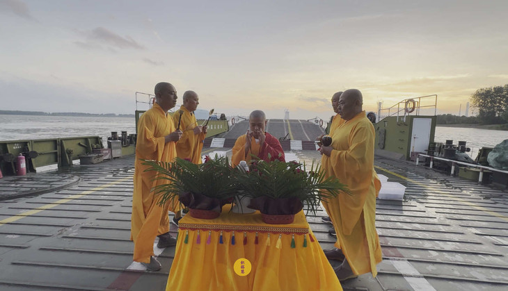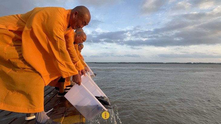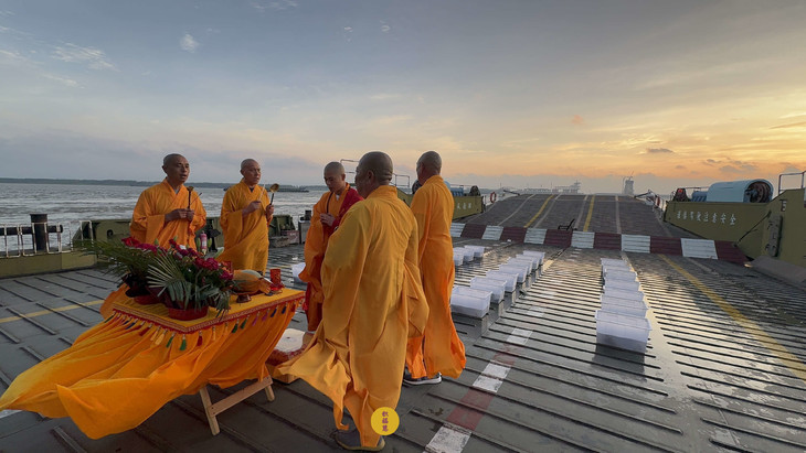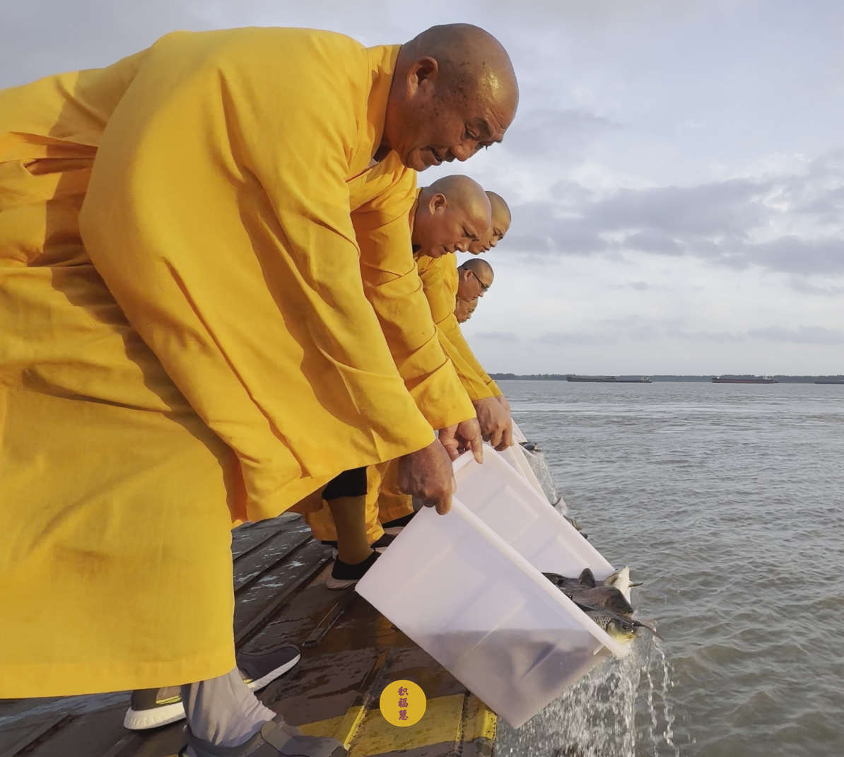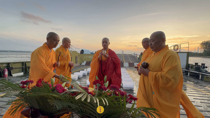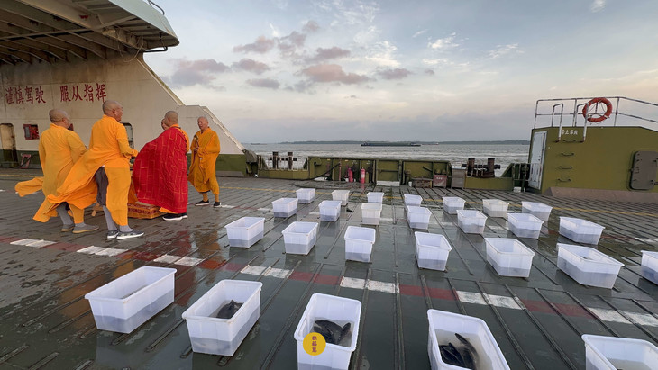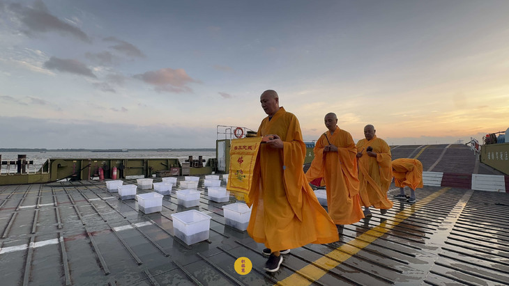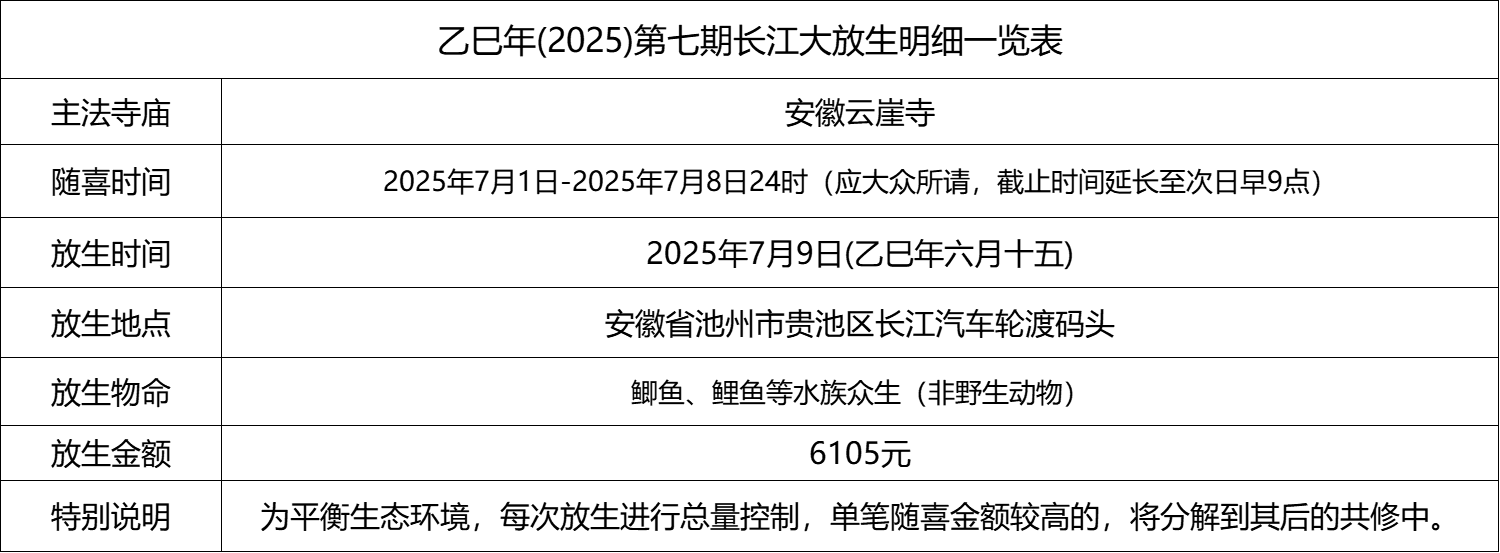 2025年7月9日,乙巳年六月十五,安徽云崖寺诸位法师在安徽省池州市贵池区长江汽车轮渡码头启建乙巳年第七期长江放生法会,放生鲫鱼、鲤鱼等水族众生。