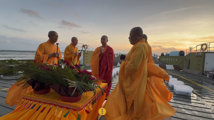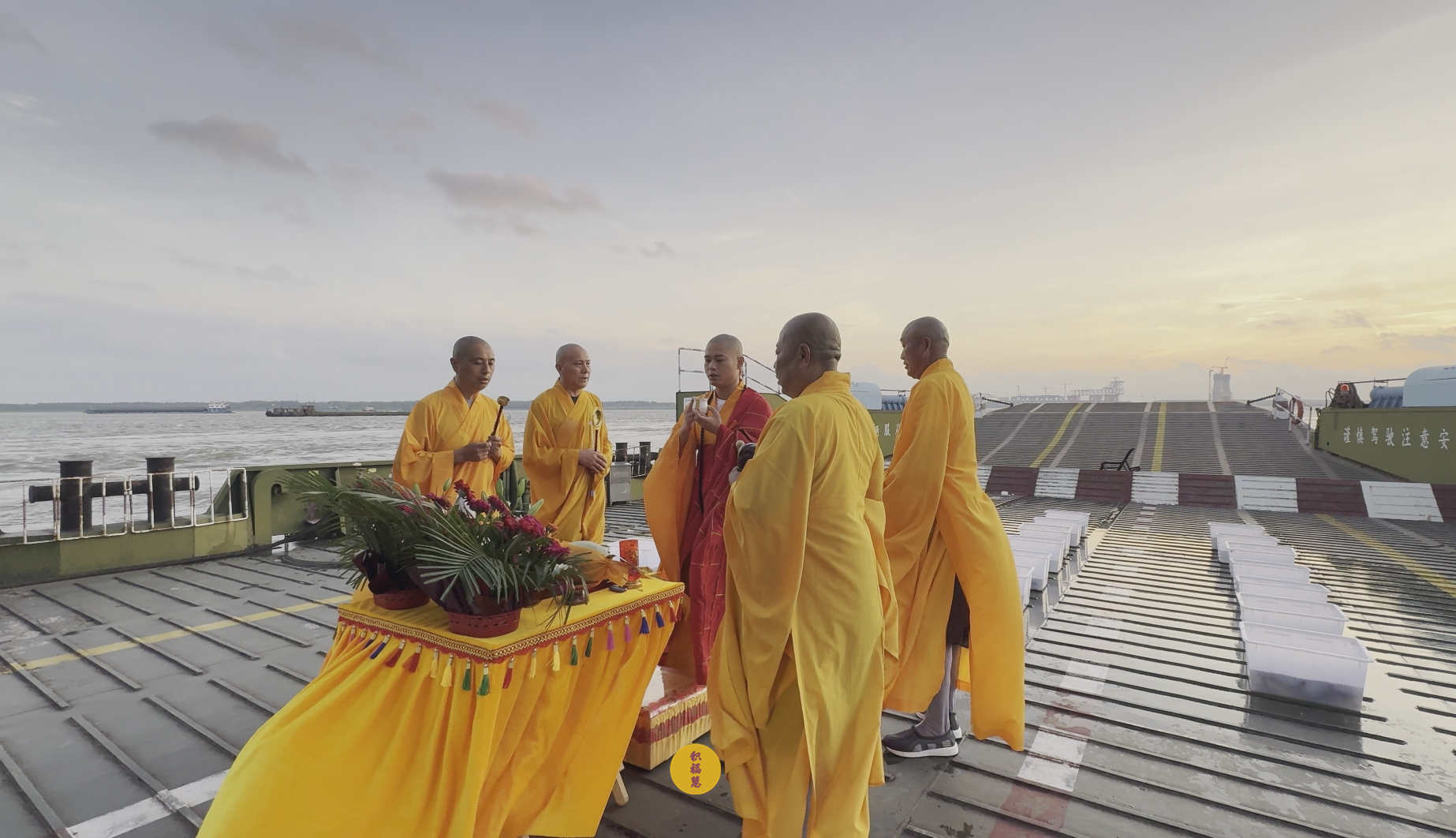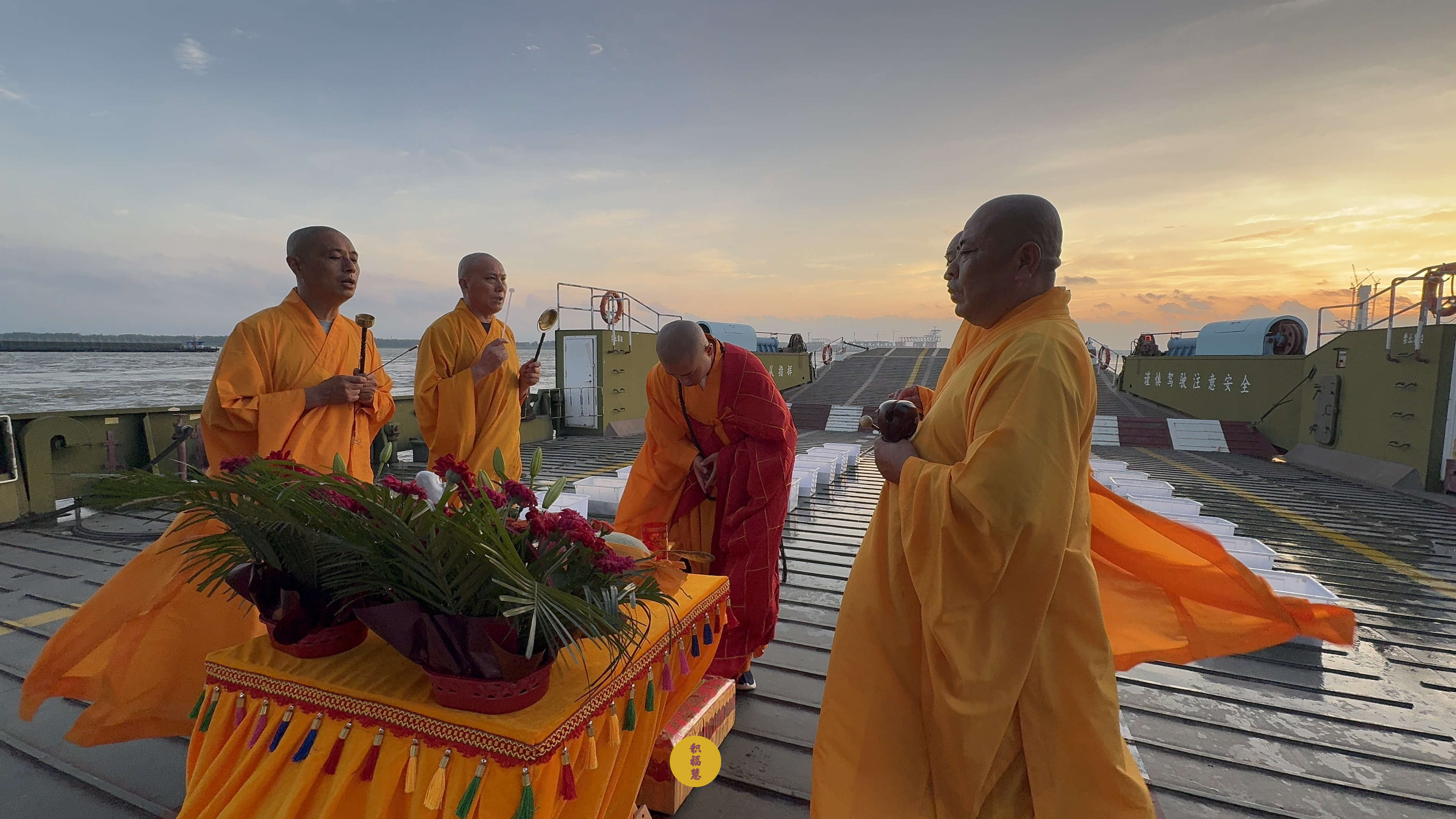 朝霞为幕,法音涤心。众法师诵杨枝净水赞,梵呗声随涛声起伏。
