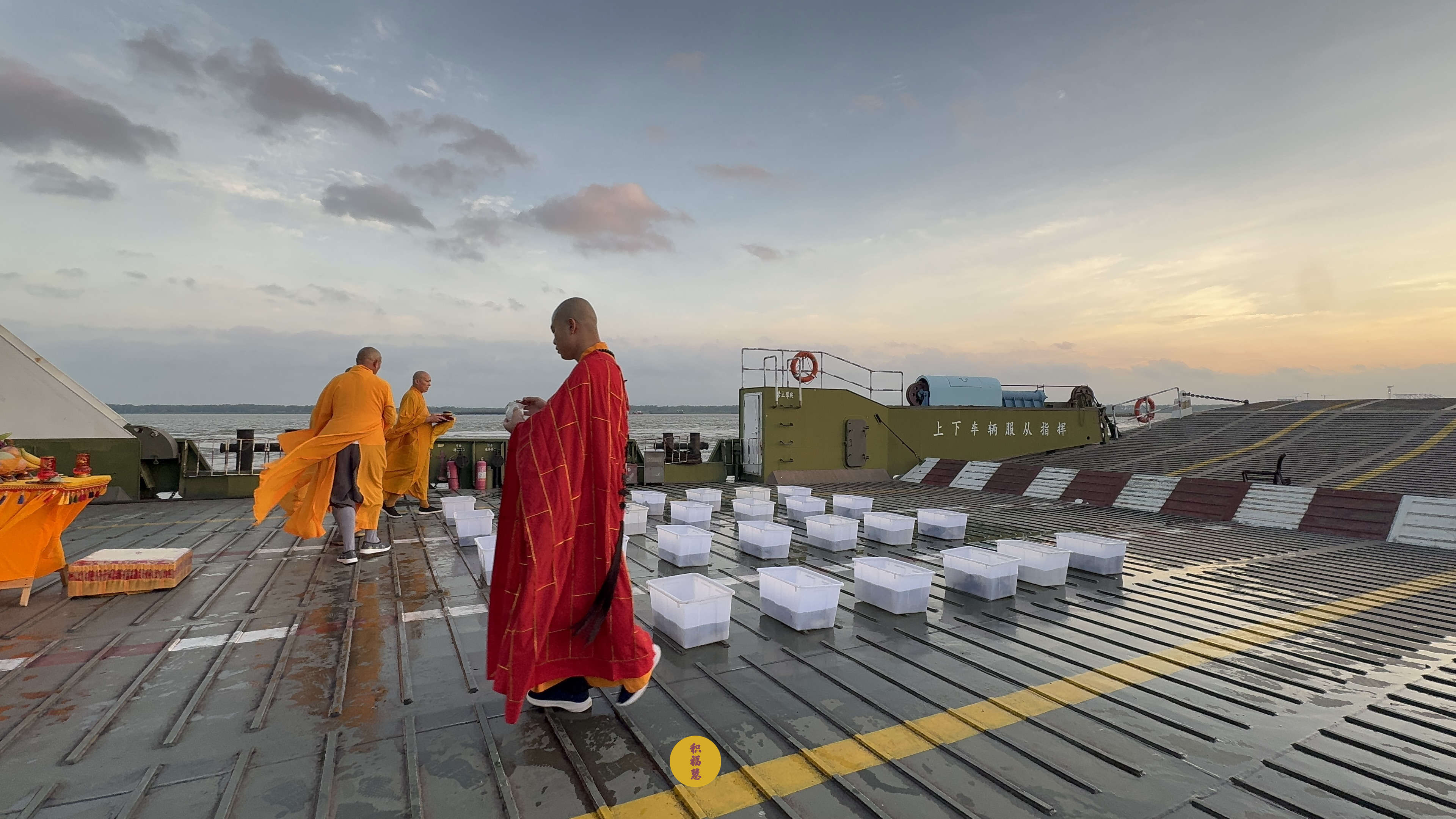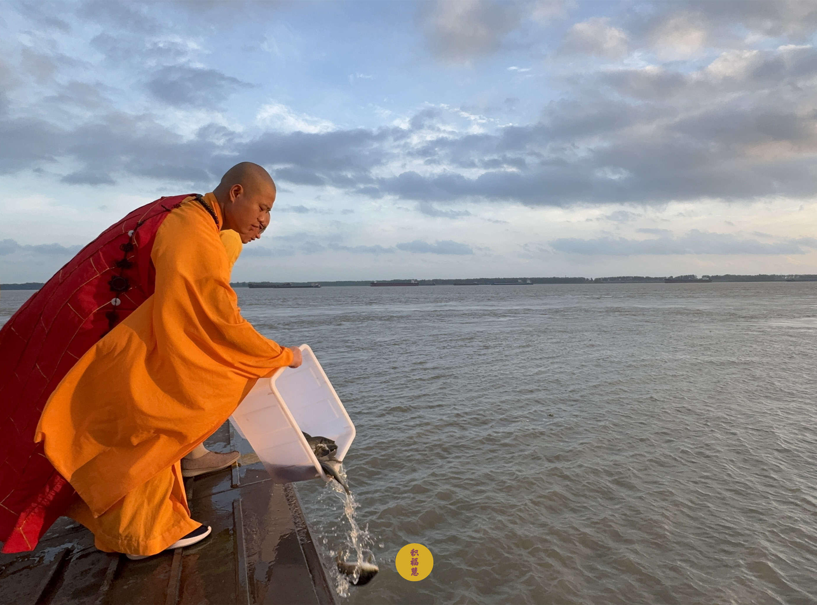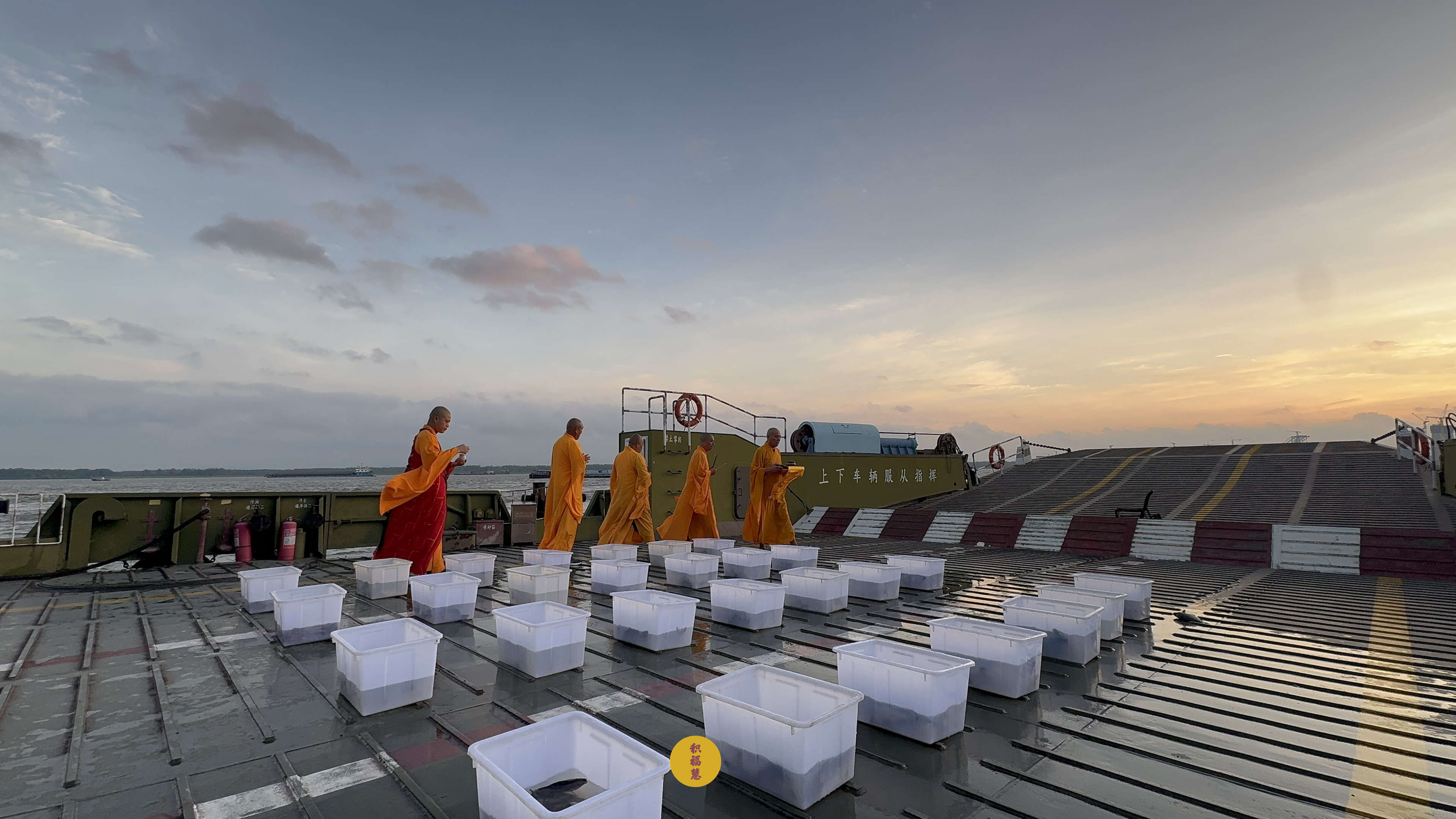 晨光浸染云霞,江风轻拂碧波。庄严的放生法会在贵池长江轮渡码头开始。