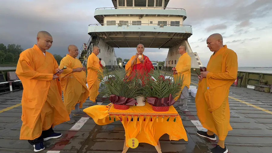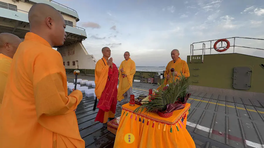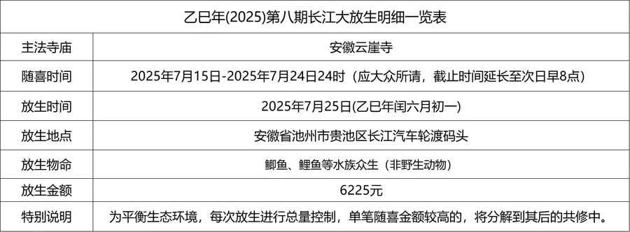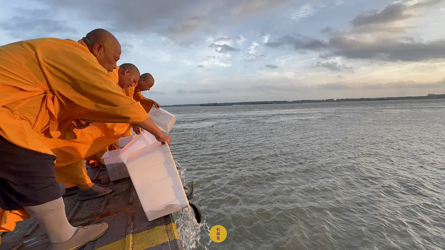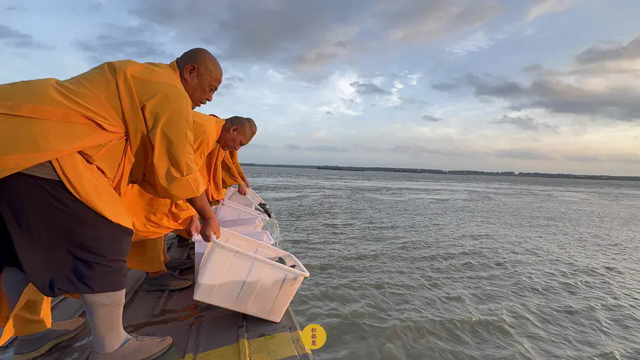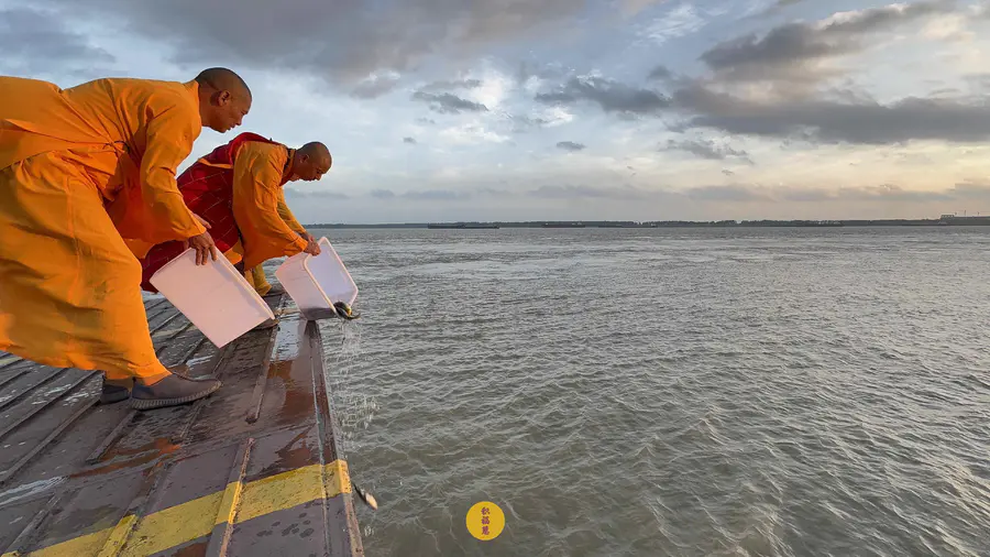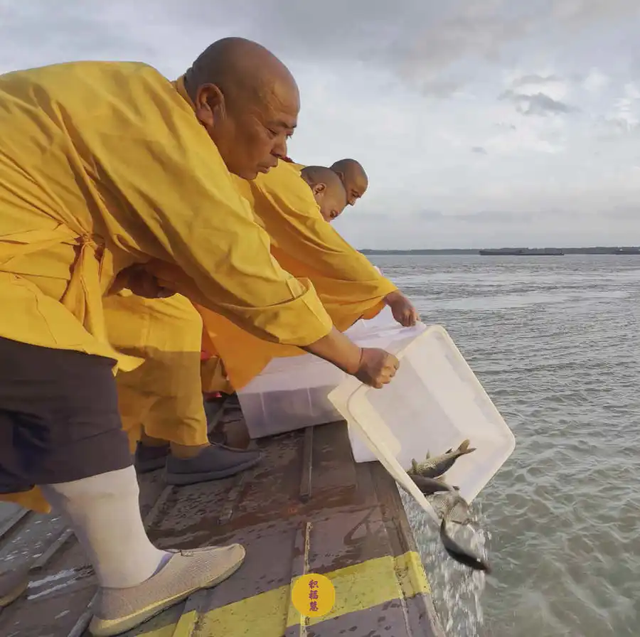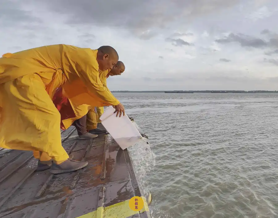 2025年7月25日,乙巳年闰六月初一,安徽云崖寺诸位法师在安徽省池州市贵池区长江汽车轮渡码头启建乙巳年第八期长江放生法会,放生鲫鱼、鲤鱼等水族众生。