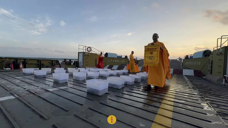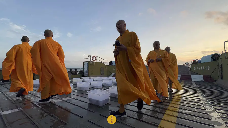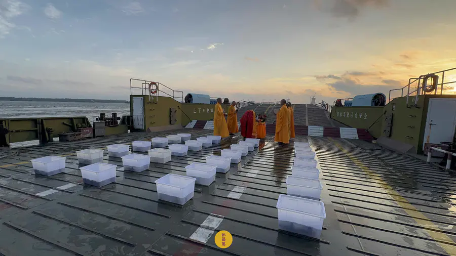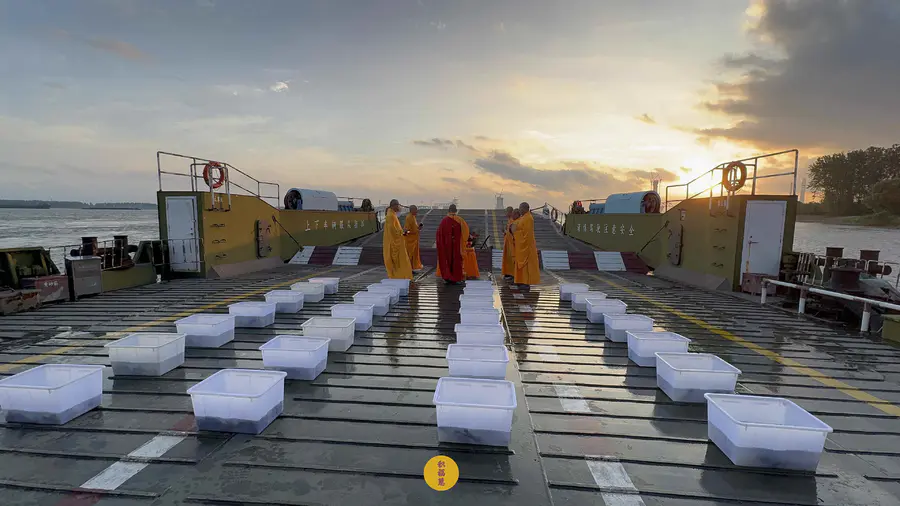 晨光初透,东方破晓。法师威仪具足,梵唱清越悠扬,放生法会在长江轮渡码头庄严启建。