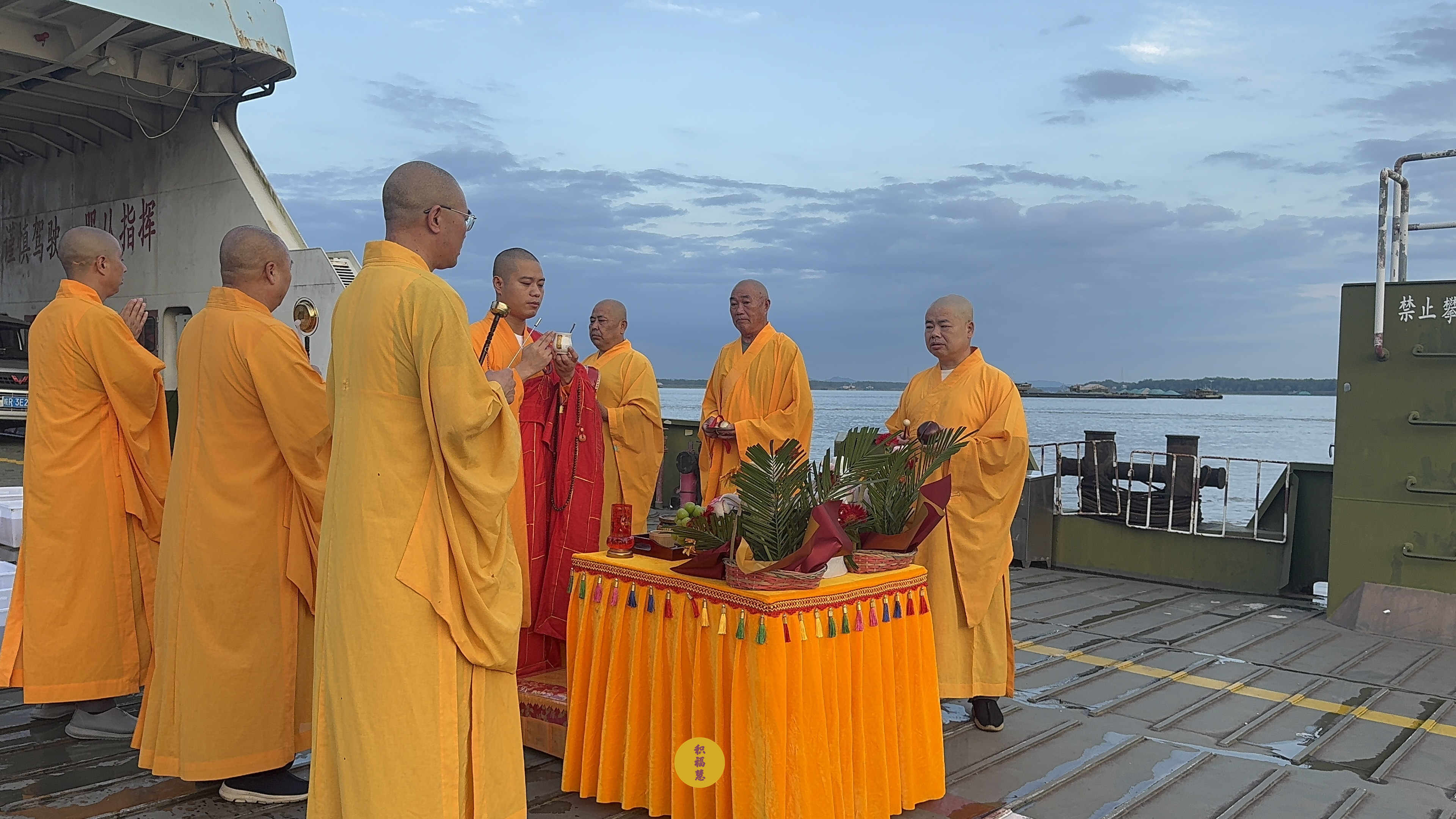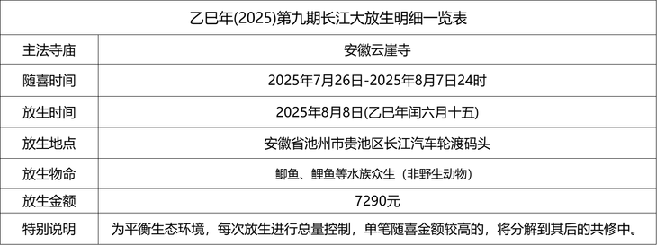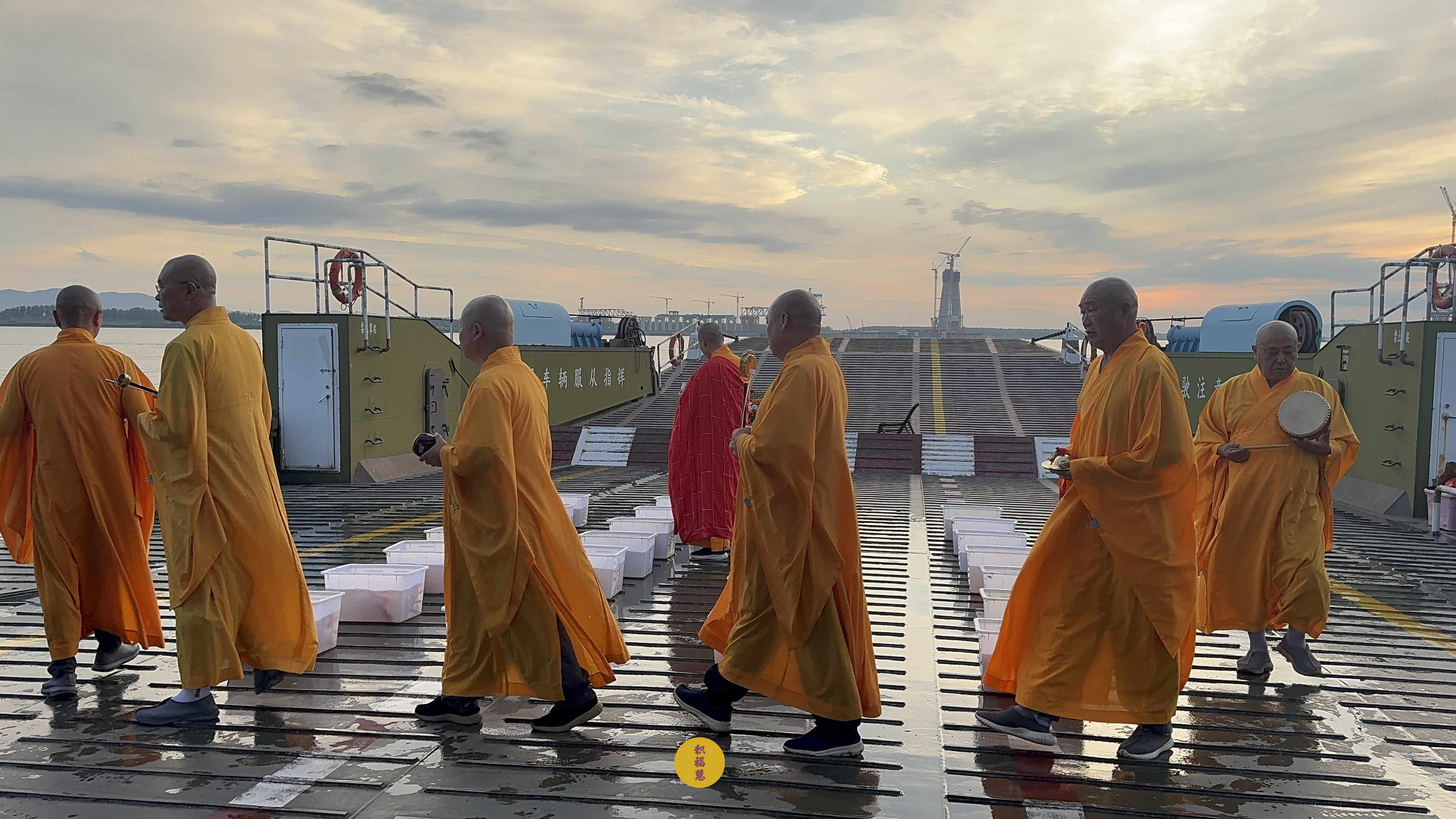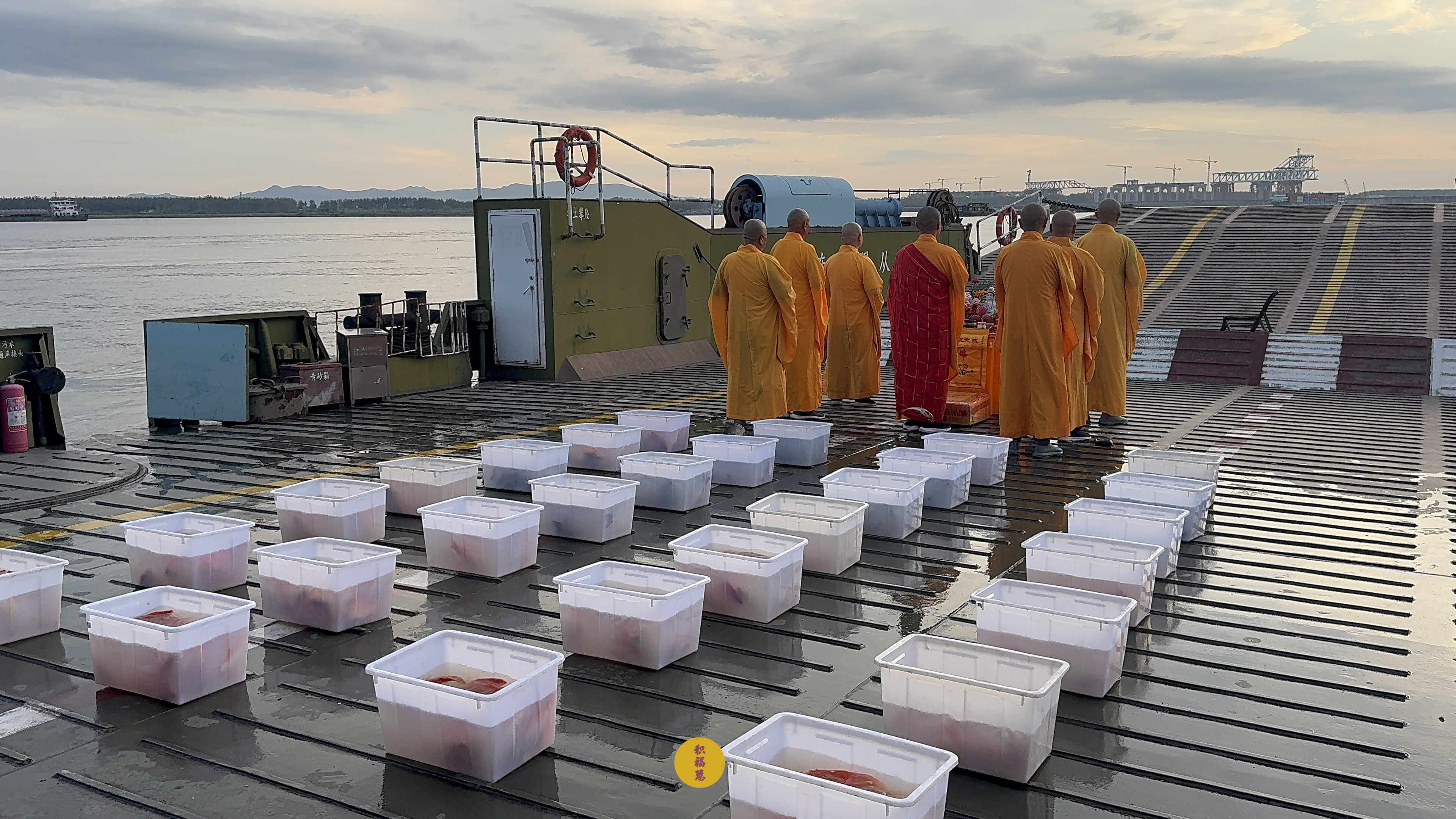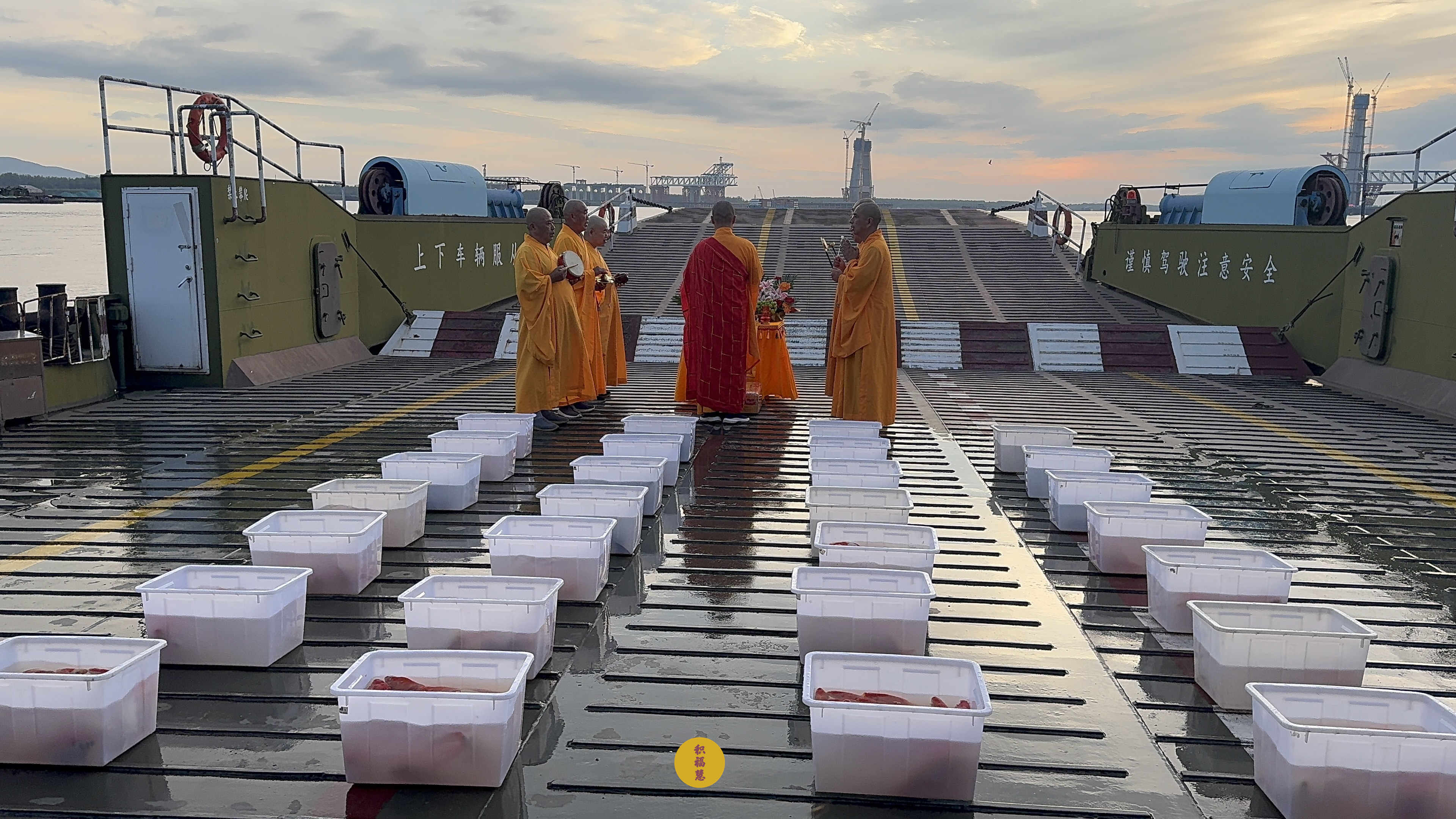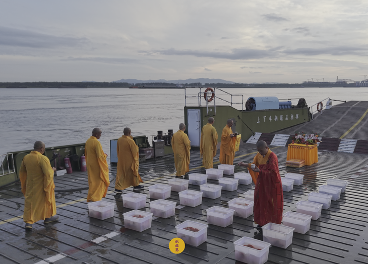 2025年8月8日,乙巳年闰六月十五,安徽云崖寺诸位法师在安徽省池州市贵池区长江汽车轮渡码头启建乙巳年第八期长江放生法会,放生鲫鱼、鲤鱼等水族众生。