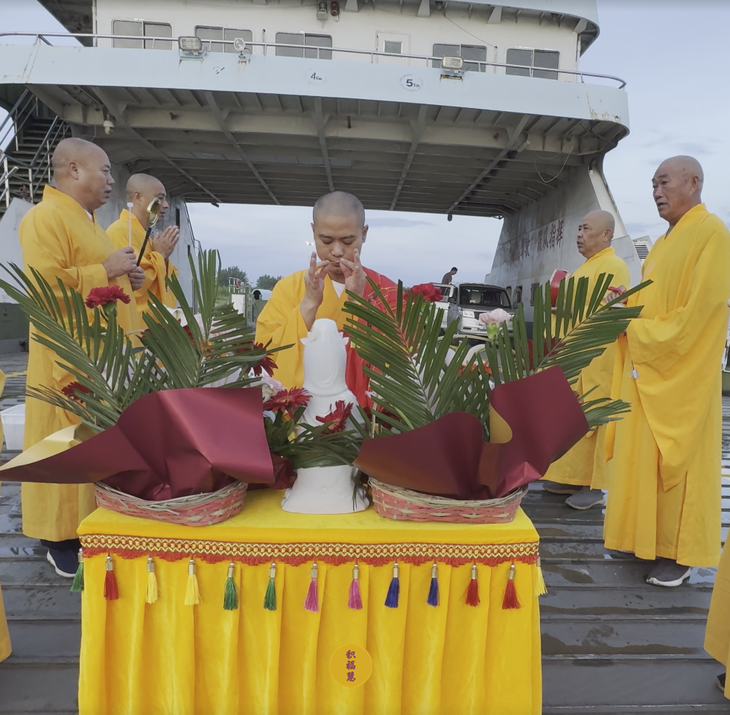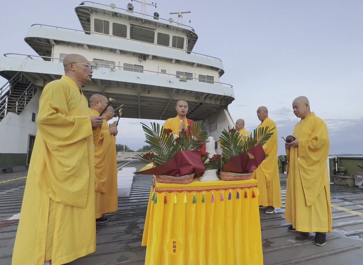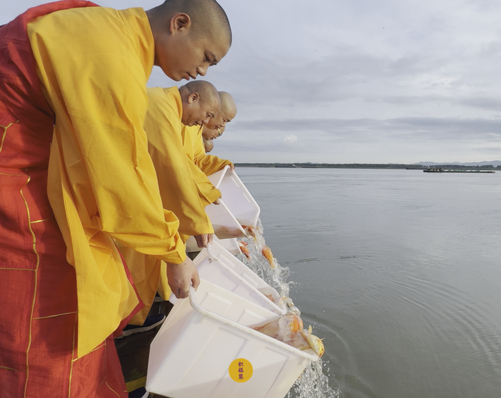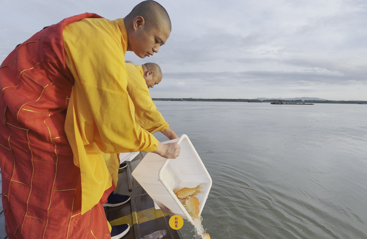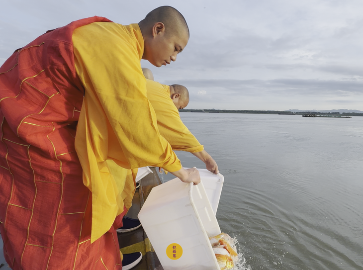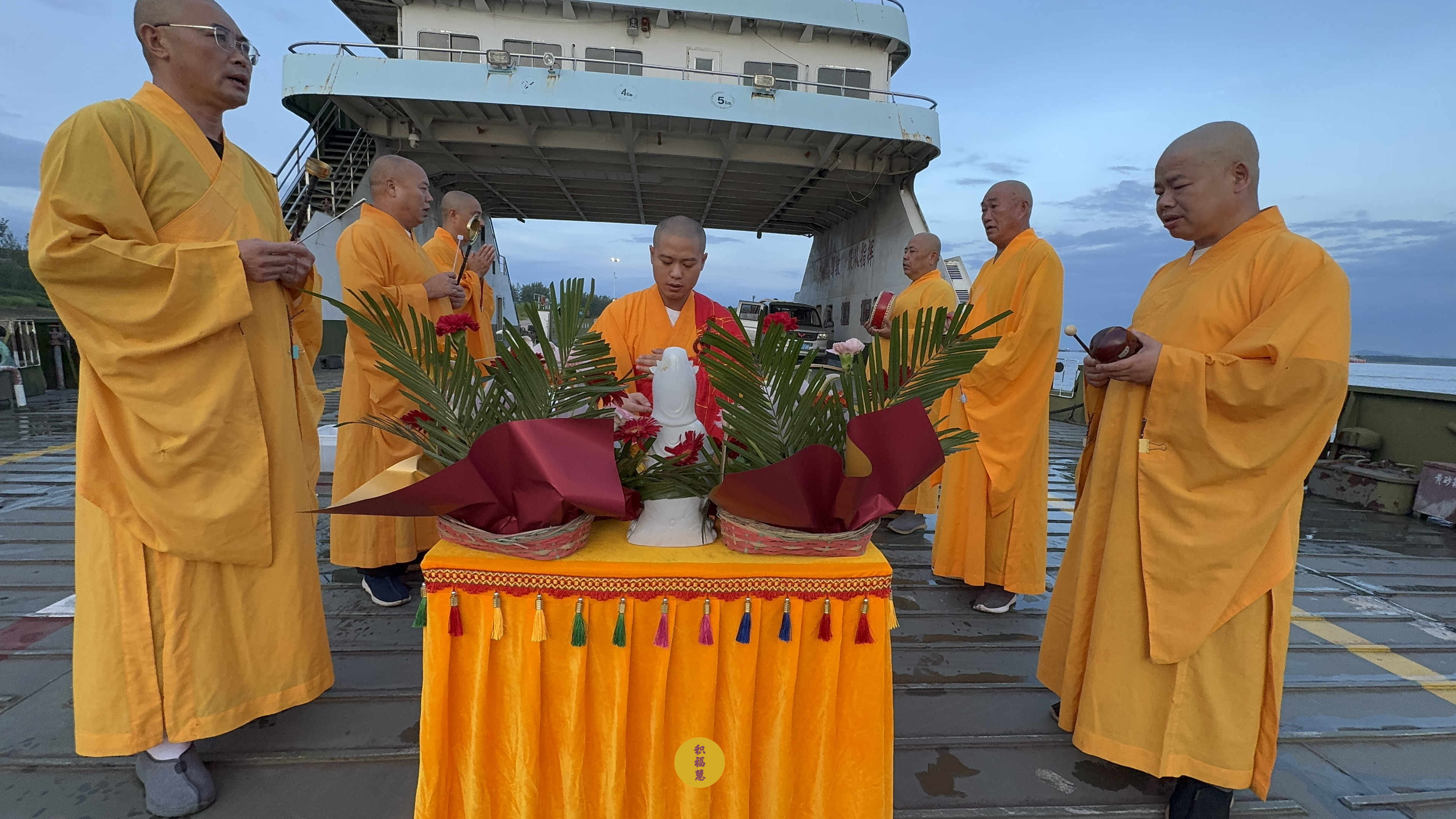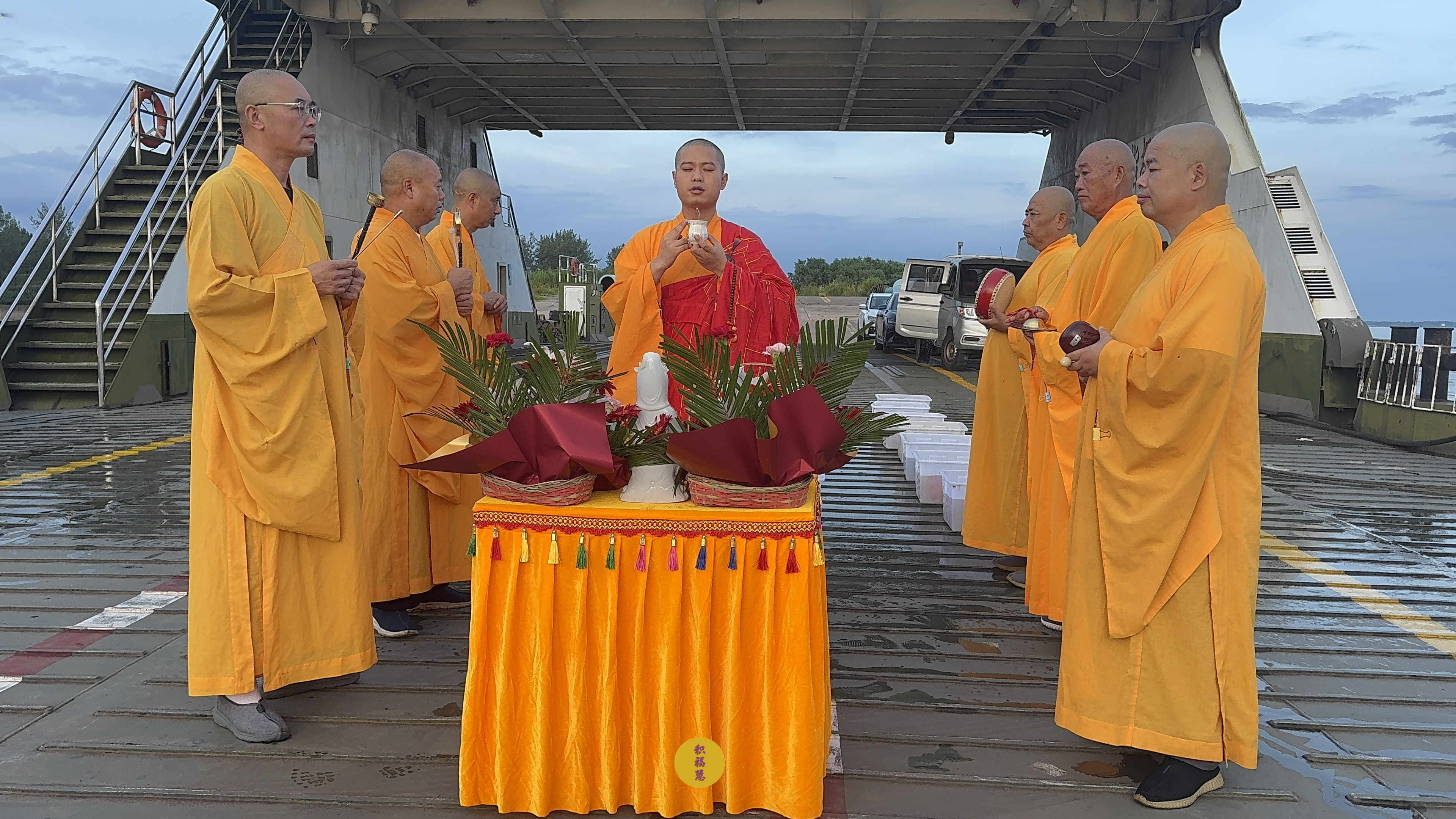 2025年8月8日,乙巳年闰六月十五,安徽云崖寺诸位法师在安徽省池州市贵池区长江汽车轮渡码头启建乙巳年第八期长江放生法会,放生鲫鱼、鲤鱼等水族众生。
